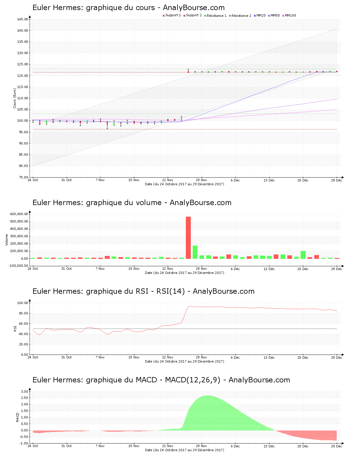 Du côté des indicateurs, l’indicateur RSI est assez stable cette semaine. Il se positionne par conséquent encore dans le niveau de surachat. Pour sa part, la moyenne mobile sur 20 jours de l’action Euler Hermes se place au-delà de la moyenne mobile sur 50 jours, et la moyenne mobile sur 50 jours se positionne elle-même au-delà de la moyenne mobile sur 100 jours. A long terme, la valeur présente ainsi un parcours croissant. L’indicateur MACD est ces derniers jours en solide baisse. C’est dorénavant une évolution du cours en ferme décroissance qu’il indique sur le court-moyen terme.