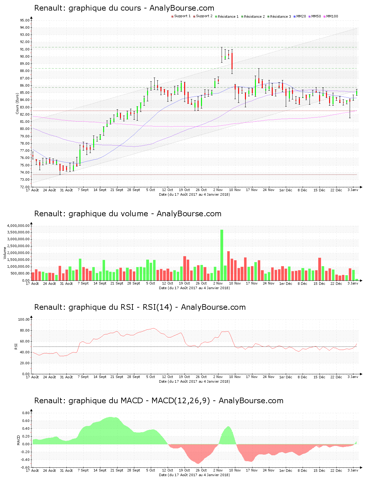Côté indicateurs, on repère qu’aujourd’hui le MACD est en conséquente progression. Ce jeudi 4 janvier, l’indicateur MACD a basculé du côté positif, ce qui pourrait esquisser un amorcement d’une trajectoire haussière pour l’action Renault sur le long terme. L’indicateur RSI est ce jeudi en augmentation. Il a basculé dans le niveau d’achat, ce qui peut révèler un prélude de tendance haussière sur le long terme pour l’action Renault.