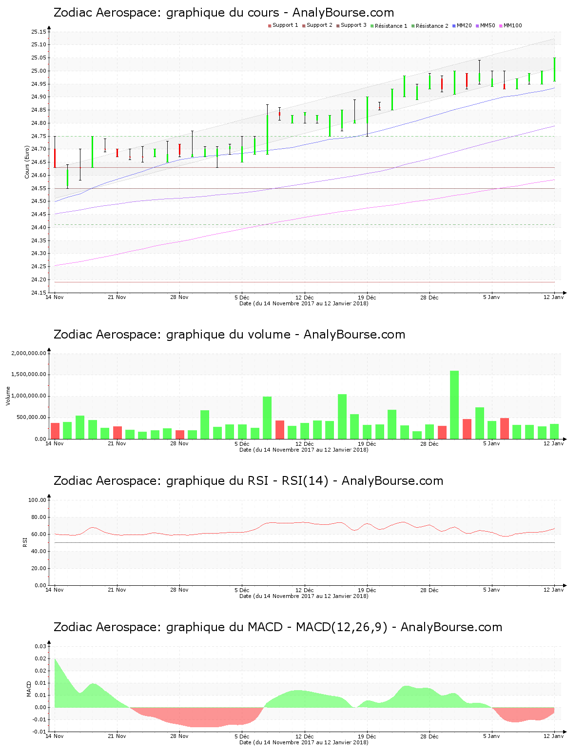 Pour les indicateurs, la moyenne mobile sur vingt jours de l’action Zodiac Aerospace se positionne au-delà de la moyenne mobile sur cinquante jours, qui se place elle-même au-delà de la moyenne mobile sur cent jours. Sur une longue période, l’action affiche ainsi un développement haussier. Pour sa part, on relève que ces cinq derniers jours de cotations le RSI est relativement stable. C’est ainsi toujours dans le niveau d’achat que ce dernier se trouve. Pour finir, l’indicateur MACD est stable ces dernières séances. C’est donc encore une tendance du cours assez stable qu’il représente sur le court-moyen terme.