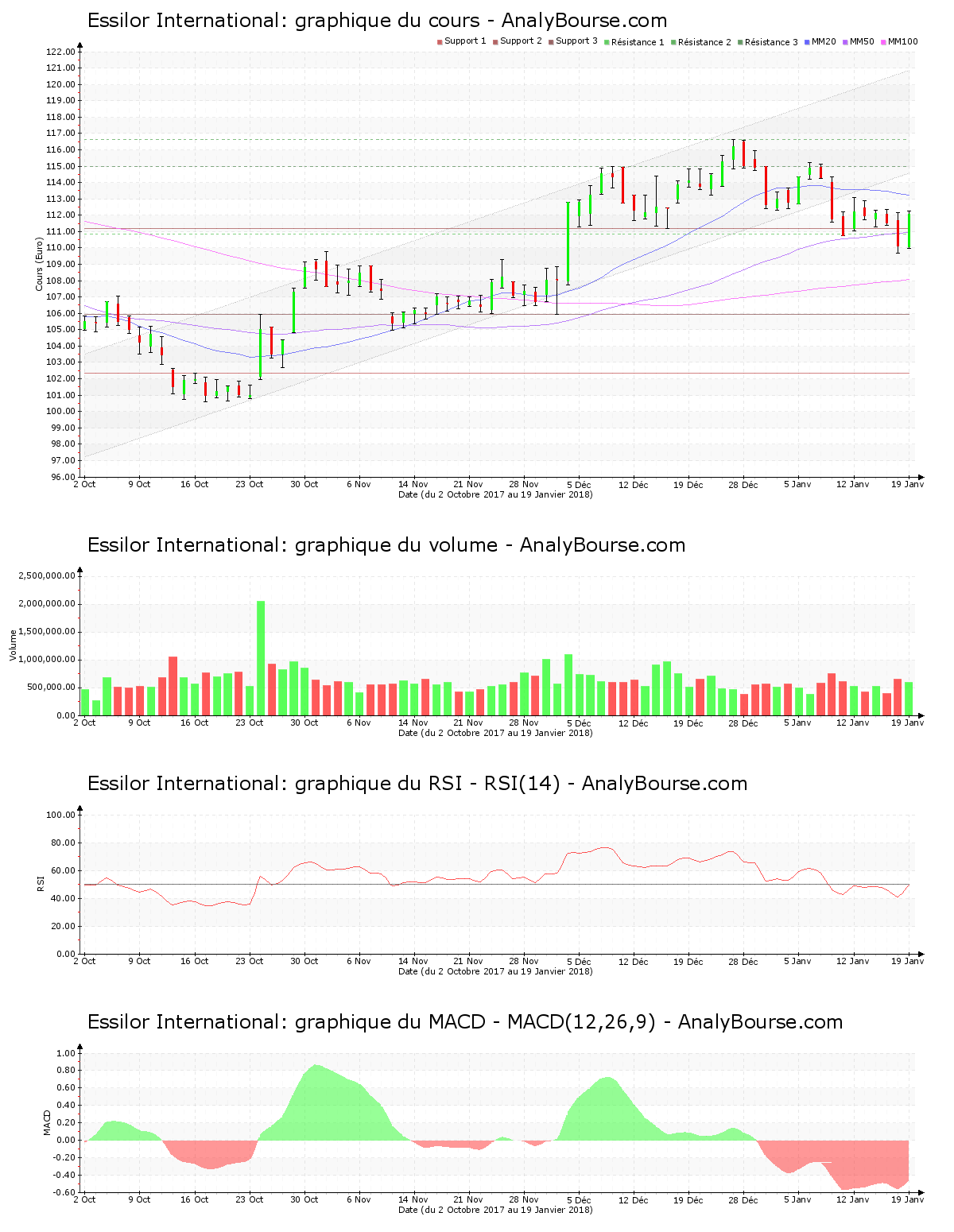 Ces informations constituent une analyse technique de la valeur Essilor International au samedi 20 janvier 2018. Cette analyse peut être invalidée par des éléments plus récents, et ne constitue en aucune manière une incitation d’achat ou de vente sur les marchés financiers. Le lecteur reste libre et responsable de l’interprétation et de l’usage faits de ces informations.