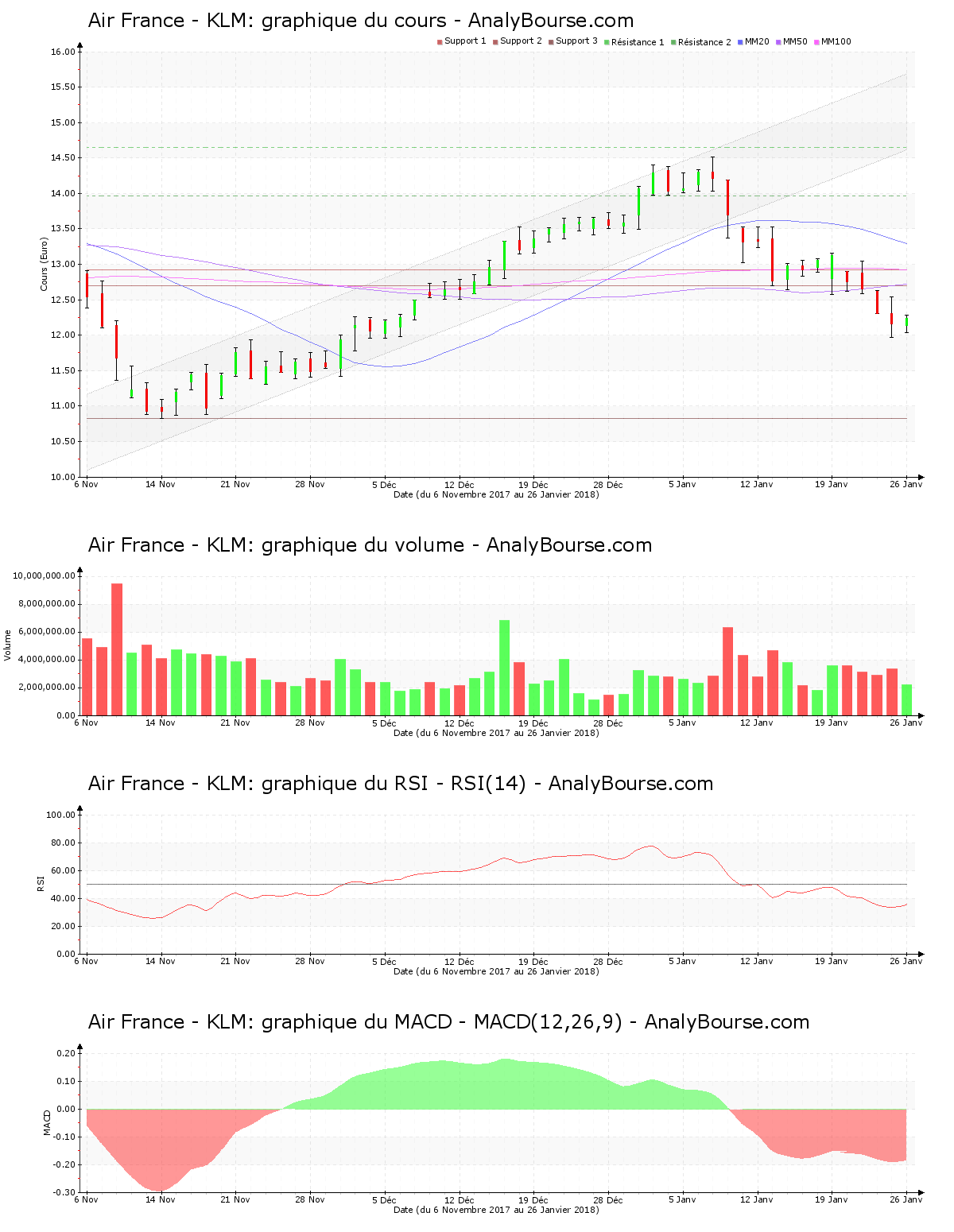 |Depuis la semaine dernière, l’action Air France – KLM accélère son mouvement en baisse. Cette dernière est ces dernières séances affectée, avec un parcours en forte diminution de 6.71%. Passant de 13.120 € à 12.240 € ces cinq dernières séances, la valeur plonge dorénavant de 0.880 €. La demande sur Air France – KLM la semaine dernière était déjà faible, quantifiée par un cours en baisse de 1.58%. La valeur Air France – KLM s’échange à son montant d’il y a plus de 34 jours de cotations. Le cours a franchi le support des 12.700 € cette semaine. Le support suivant se trouve à 10.820 €. Air France – KLM fluctue ces derniers jours dans des limites de 8.94%, ce qui montre une sensible agitation sur le cours. L’action se localise très en deçà de son canal. Elle ne se borne en effet plus dans le canal dans lequel cette dernière se développait depuis quelques temps.
