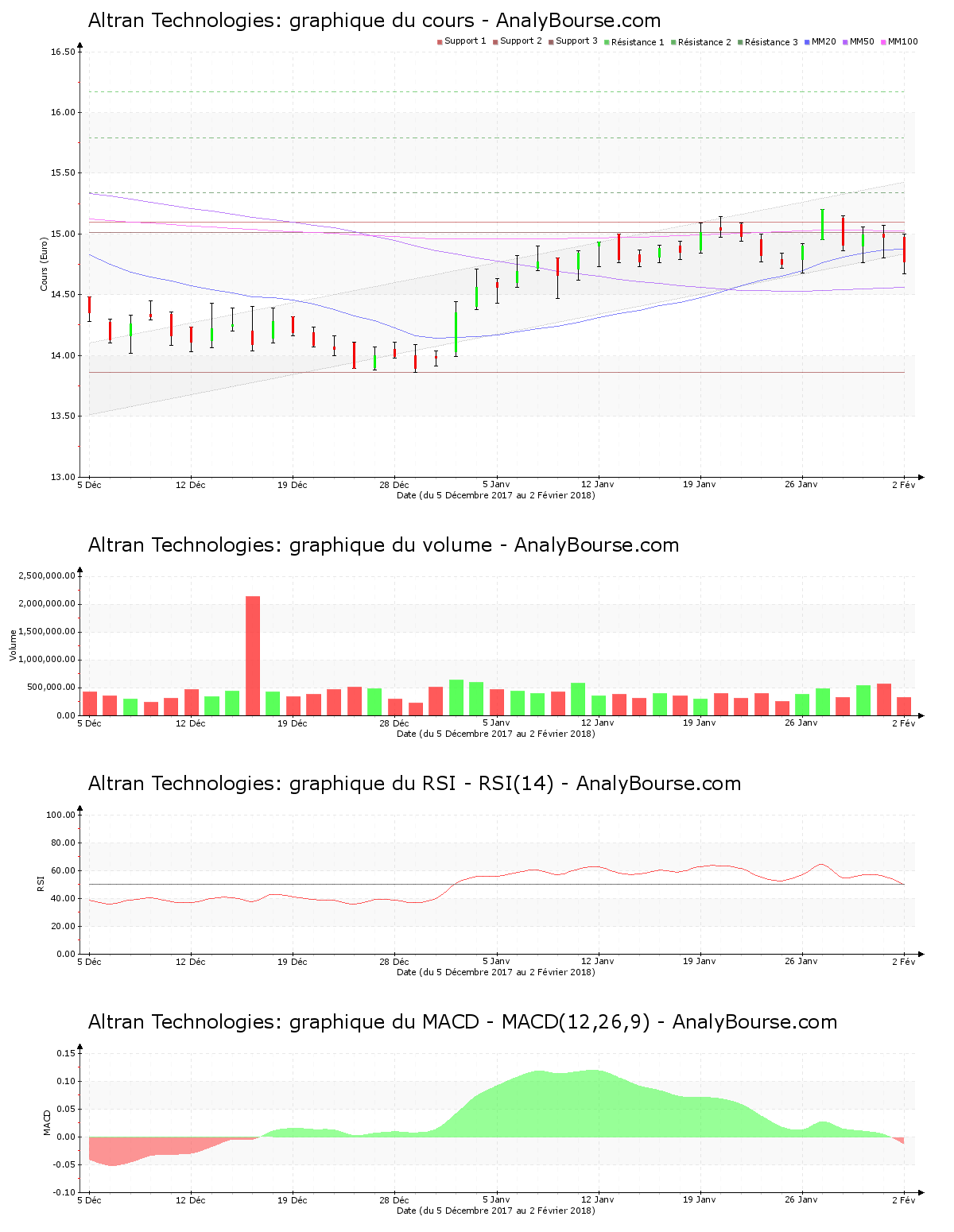 Avec un mouvement plutôt stable de 0.87%, Altran Technologies est toujours ces dernières séances plutôt peu sollicité. Avec un cours en régression de 0.73%, l’action Altran Technologies stagnait déjà la semaine dernière. Cette dernière se négocie ainsi désormais à 14.770 €. Le développement du titre l’emmène finalement près du support des 14.230 €. L’action varie en-dessous de son canal. Elle ne navigue effectivement plus dans le canal à l’intérieur duquel cette dernière s’enfermait ces dernières semaines.