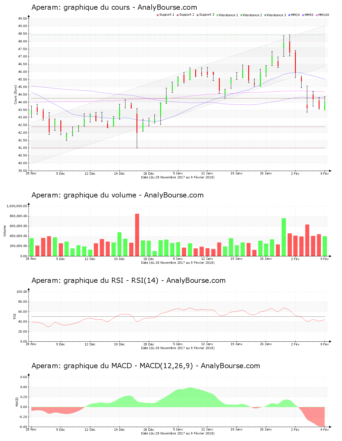 Côté indicateurs, le RSI est en baisse cette semaine. C’est maintenant au niveau de vente qu’il se place. Enfin, le MACD est ces derniers jours en importante décroissance. C’est désormais une évolution du cours en vigoureuse baisse qu’il dévoile sur le moyen terme. L’indicateur MACD est passé du côté négatif lundi dernier, cela pourrait révèler un prémice d’une évolution baissière à long terme pour Aperam.