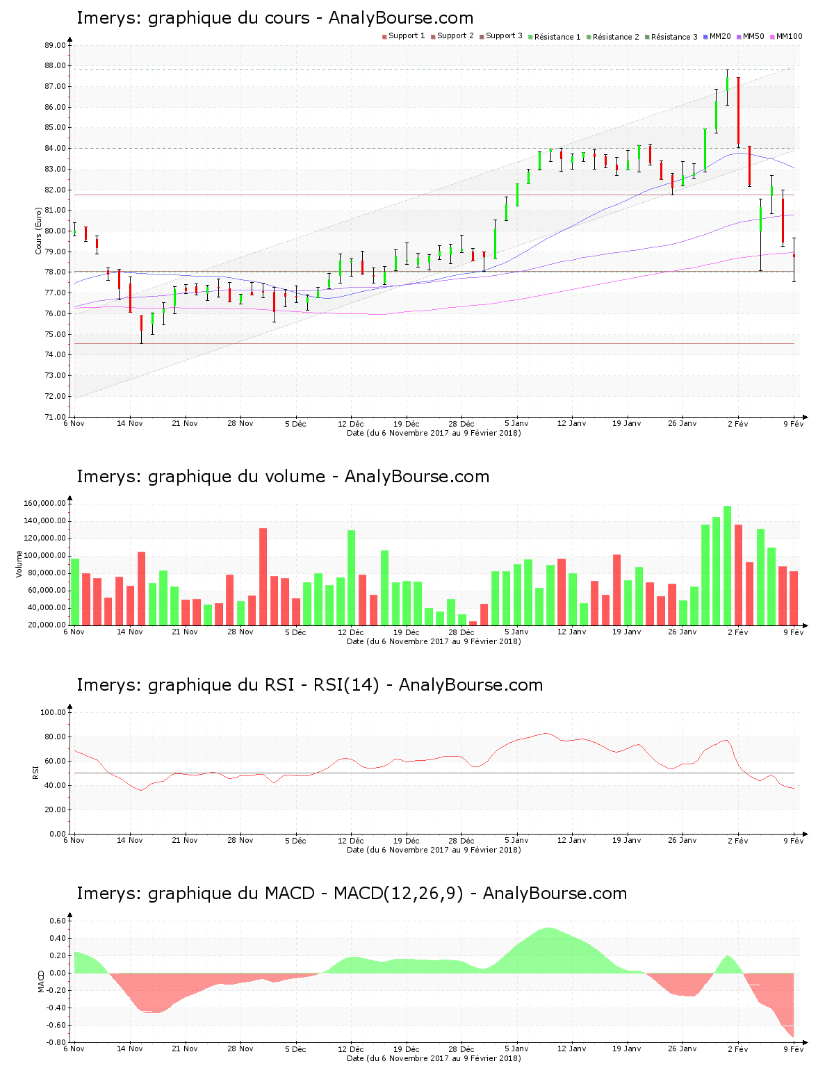 Avec un cours décroissant de 6.53%, Imerys est en ferme décroissance ces cinq derniers jours. La valeur atteint maintenant la valorisation de 78.750 €. Avec un mouvement en croissance de 1.87%, Imerys était à l’opposé la semaine dernière demandé. L’action Imerys rebaisse par conséquent de manière sensible cette semaine. Relevons, avec un taux de 8.45% écartant ces cinq derniers jours de cotations les extremums, une manifeste effervescence sur Imerys. Enfin, le cours a franchi le support des 81.750 € cette semaine. Le support suivant se trouve à 78.050 €. L’action ne se limite plus dans le canal dans lequel cette dernière naviguait depuis plusieurs semaines. Elle se positionne désormais fortement en-dessous de son canal.