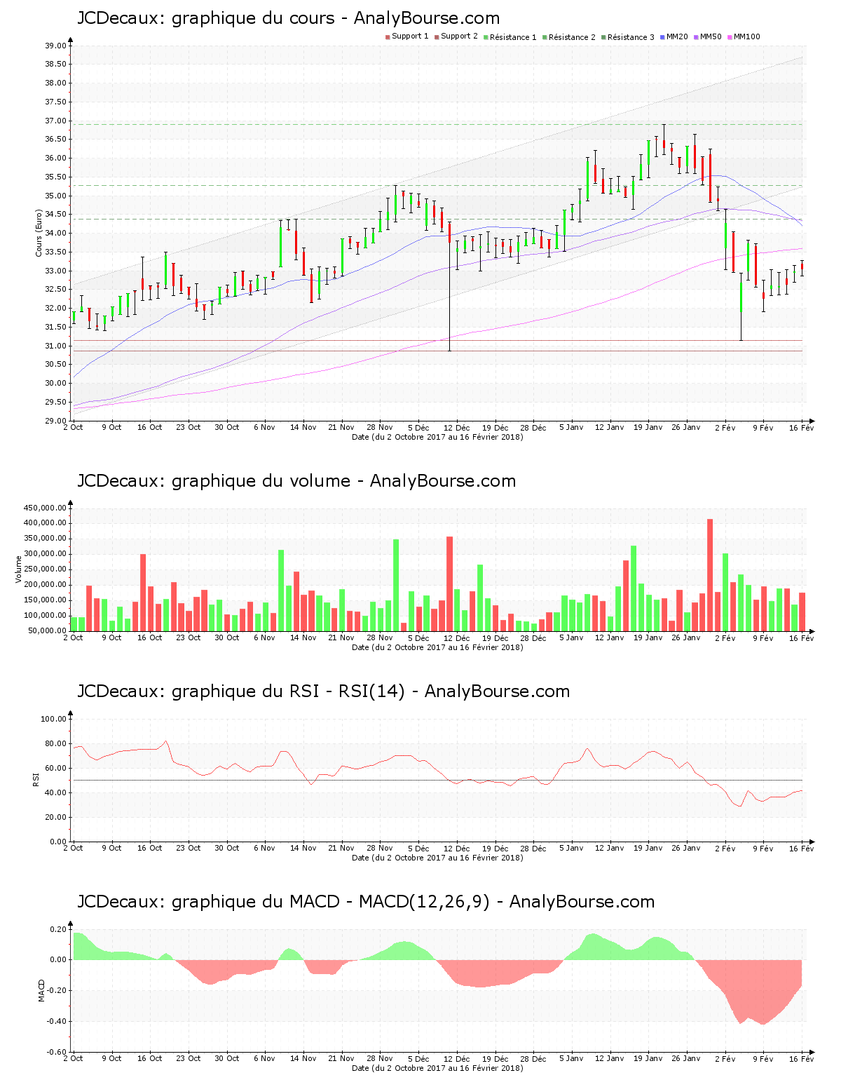 En ce qui concerne les indicateurs, l’indicateur MACD est en conséquente hausse ces dernières séances. Ce dernier suggère néanmoins encore une trajectoire du titre en substantielle décroissance à court-moyen terme. De son côté, la moyenne mobile sur vingt jours de la valeur JCDecaux a croisé la moyenne mobile sur cinquante jours jeudi dernier. La moyenne mobile sur cinquante jours de l’action JCDecaux se place maintenant au-delà de sa moyenne mobile sur cent jours depuis 98 séances de cotations. Pour terminer, le RSI est plutôt stable ces cinq derniers jours. C’est ainsi encore au niveau de vente que ce dernier se positionne.