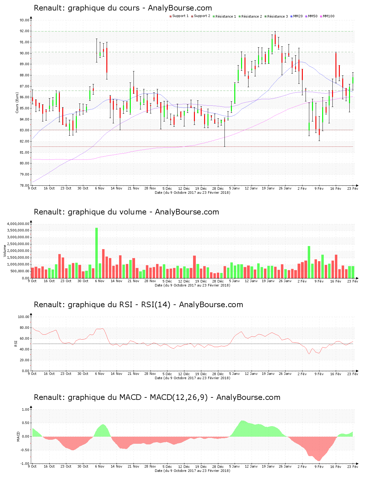 Du côté des indicateurs, l’indicateur RSI est stable ces cinq dernières séances. Il se trouve par conséquent encore au niveau neutre. En ce qui concerne l’indicateur MACD, on observe qu’il est en solide progression cette semaine. Ce dernier indique maintenant une évolution du titre en grande croissance à moyen-court terme. L’indicateur MACD est passé du côté positif lundi dernier, ce qui peut révèler un prémice d’une trajectoire en progression à longue échéance pour Renault. Pour finir, la moyenne mobile sur vingt jours de l’action Renault se trouve en deçà de sa moyenne mobile sur cinquante jours depuis mercredi dernier. La moyenne mobile sur cinquante jours de l’action Renault se trouve désormais au-delà de sa moyenne mobile sur cent jours depuis 84 séances de cotations.