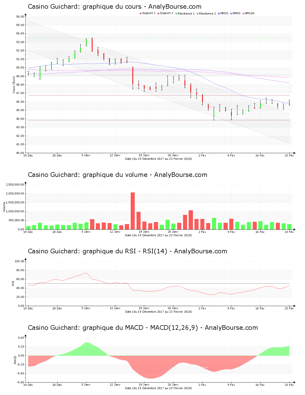 On observe que le RSI est assez stable ces cinq derniers jours. Ce dernier se place donc encore au niveau neutre. Le MACD est en vigoureuse hausse ces derniers jours. C’est maintenant une tendance du titre en grande hausse que ce dernier indique sur le moyen-court terme. Pour finir, la moyenne mobile sur 20 jours de l’action Casino Guichard se place en-dessous de la moyenne mobile sur 50 jours, qui se situe elle-même en deçà de la moyenne mobile sur 100 jours. A long terme, l’action montre donc un cours en diminution.