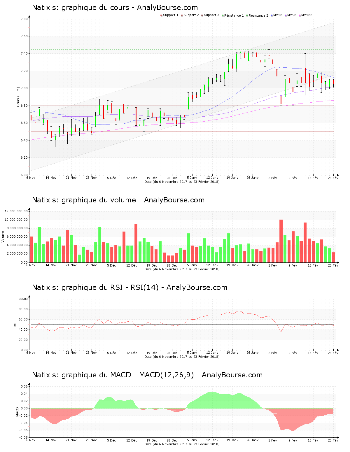 Du côté des indicateurs, le MACD est en hausse cette semaine. C’est à présent une trajectoire du cours relativement stable qu’il révèle à court-moyen terme. On note que ces dernières séances le RSI est assez stable. C’est donc encore au niveau neutre que ce dernier se trouve. La moyenne mobile sur 20 jours de la valeur Natixis se positionne au-delà de la moyenne mobile sur 50 jours, qui se positionne elle-même au-dessus de la moyenne mobile sur 100 jours. L’action affiche donc un mouvement haussier sur une longue période. La moyenne mobile sur 20 jours de l’action Natixis se situe maintenant au-delà de sa moyenne mobile sur 50 jours depuis 44 séances de cotations.