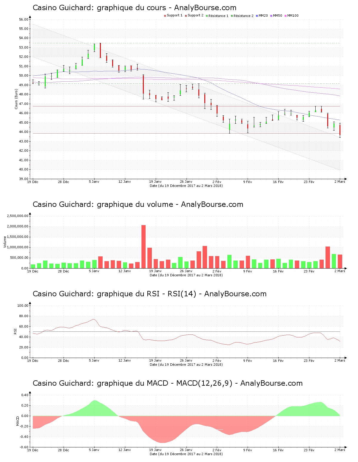 En ce qui concerne les indicateurs, le RSI est en régression ces dernières séances. C’est maintenant au niveau de vente que ce dernier se trouve. L’action Casino Guichard a une moyenne mobile sur vingt jours placée en deçà de sa moyenne mobile sur cinquante jours, qui est elle-même située en deçà de sa moyenne mobile sur cent jours. A long terme, l’action traduit par conséquent un cours baissier. L’indicateur MACD est ces cinq derniers jours en forte décroissance. C’est dorénavant une évolution du titre relativement stable que ce dernier signale à court-moyen terme.