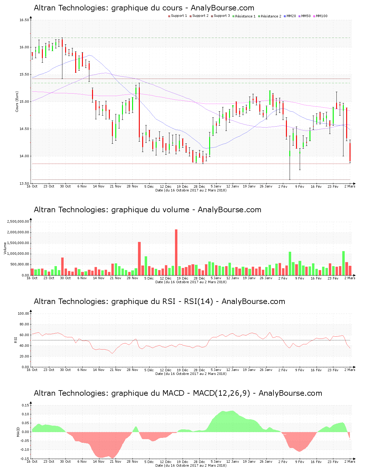 Représentée par un cours décroissant de 6.58%, la volonté d’achat sur Altran Technologies ces dernières séances est particulièrement faible. La valeur atteint à présent 13.910 €. L’intention d’achat sur Altran Technologies la semaine dernière était par contre bien présente, symbolisée par un mouvement haussier de 1.15%. L’action Altran Technologies rebaisse ainsi sensiblement ces derniers jours. Il s’agit de la première fois depuis plus de 43 séances de cotations que la valeur Altran Technologies dépasse ce niveau. Le comportement du cours l’entraîne à présent proche du support des 13.860 €. Enfin, on remarque une relative fébrilité ces dernières séances sur le titre, avec un pourcentage de 9.37% qui éloigne le maximum du minimum de Altran Technologies.