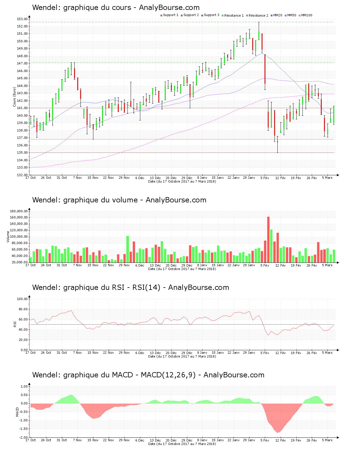 Côté indicateurs, on note que ce mercredi 7 mars le MACD est en conséquente progression. Ce mercredi 7 mars, le MACD a basculé en secteur positif, ce qui pourrait révèler une base d’une évolution croissante pour la valeur Wendel à longue échéance.