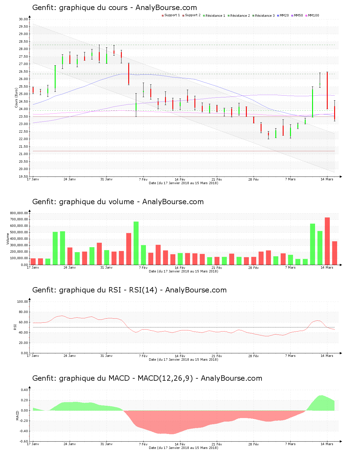 Dans un volume d’approximativement 364000 actions échangées à 15:41, avec un comportement baissier de 2.83%, la valeur Genfit est encore en conséquente décroissance ce jour. Cette dernière était déjà hier attaquée, avec un mouvement en vigoureuse baisse de 6.61%. La valeur chute dorénavant de 0.680 €, évoluant de 24.000 € à 23.320 €. Relevons, avec un taux de 5.95% écartant ce jour le maximum du minimum, une manifeste fébrilité sur Genfit. Le cours a franchi le support des 23.500 € aujourd’hui. Le support suivant se trouve à 21.200 €.