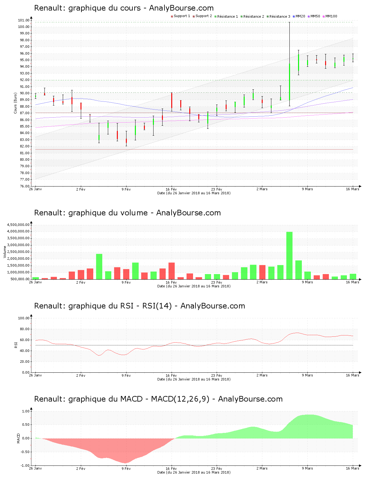 Ces informations constituent une analyse technique de l’action Renault au samedi 17 mars 2018. Cette analyse peut être invalidée par des éléments plus récents, et ne constitue en aucune manière une incitation d’achat ou de vente sur les marchés financiers. Le lecteur reste libre et responsable de l’interprétation et de l’usage faits de ces informations.
