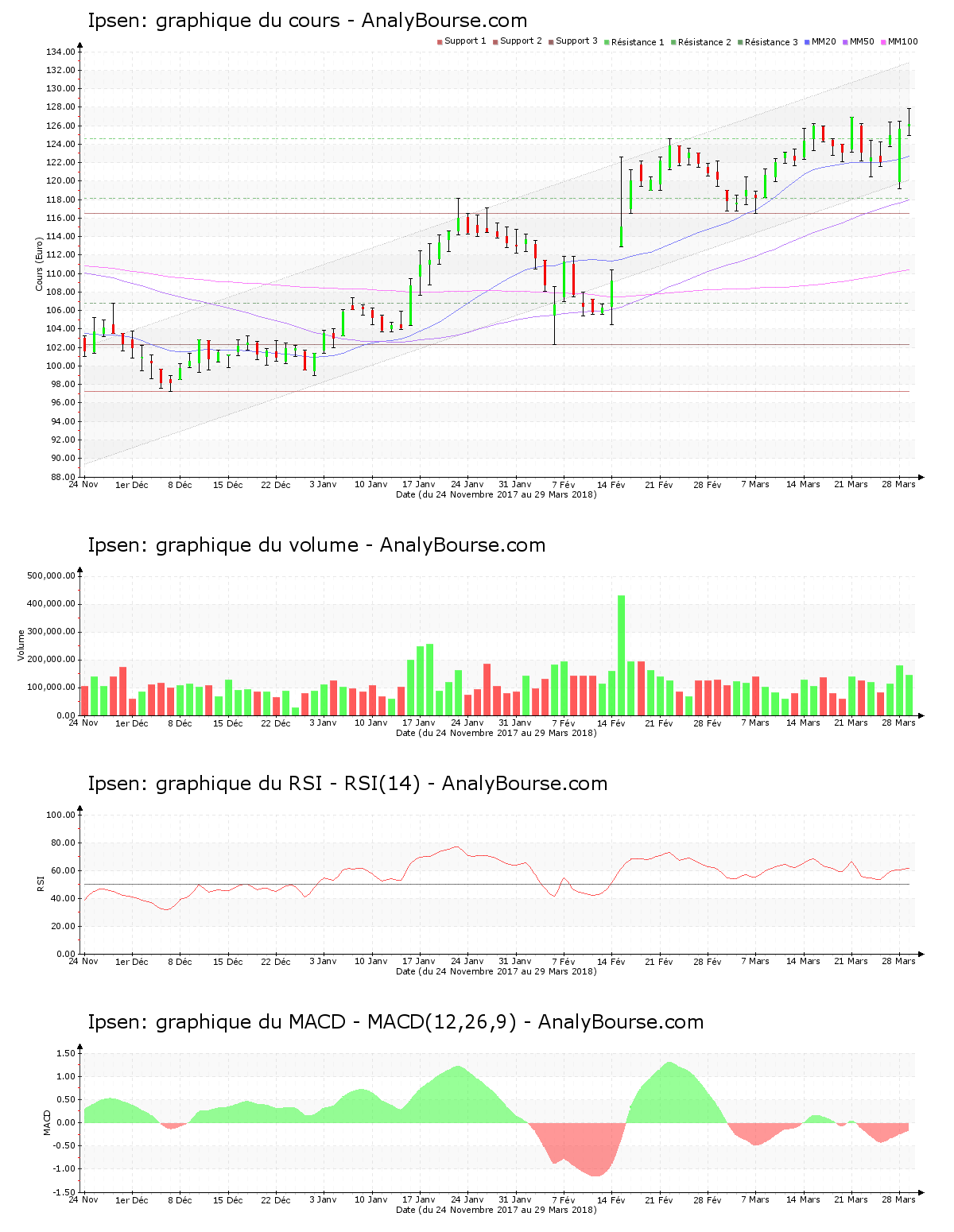 Du côté des indicateurs, l’indicateur MACD est ces cinq dernières séances de cotations en diminution. C’est finalement une évolution du titre en conséquente diminution qu’il révèle sur le moyen terme. Pour sa part, l’action Ipsen a une moyenne mobile sur vingt jours localisée au-delà de sa moyenne mobile sur cinquante jours, qui est pour sa part située au-delà de sa moyenne mobile sur cent jours. A longue échéance, le développement de l’action est ainsi en hausse. Depuis dorénavant 56 jours de cotations, la moyenne mobile sur vingt jours de l’action Ipsen se positionne au-delà de sa moyenne mobile sur cinquante jours. Pour le RSI, on constate qu’il est assez stable cette semaine. Ce dernier se place par conséquent encore dans le niveau d’achat.