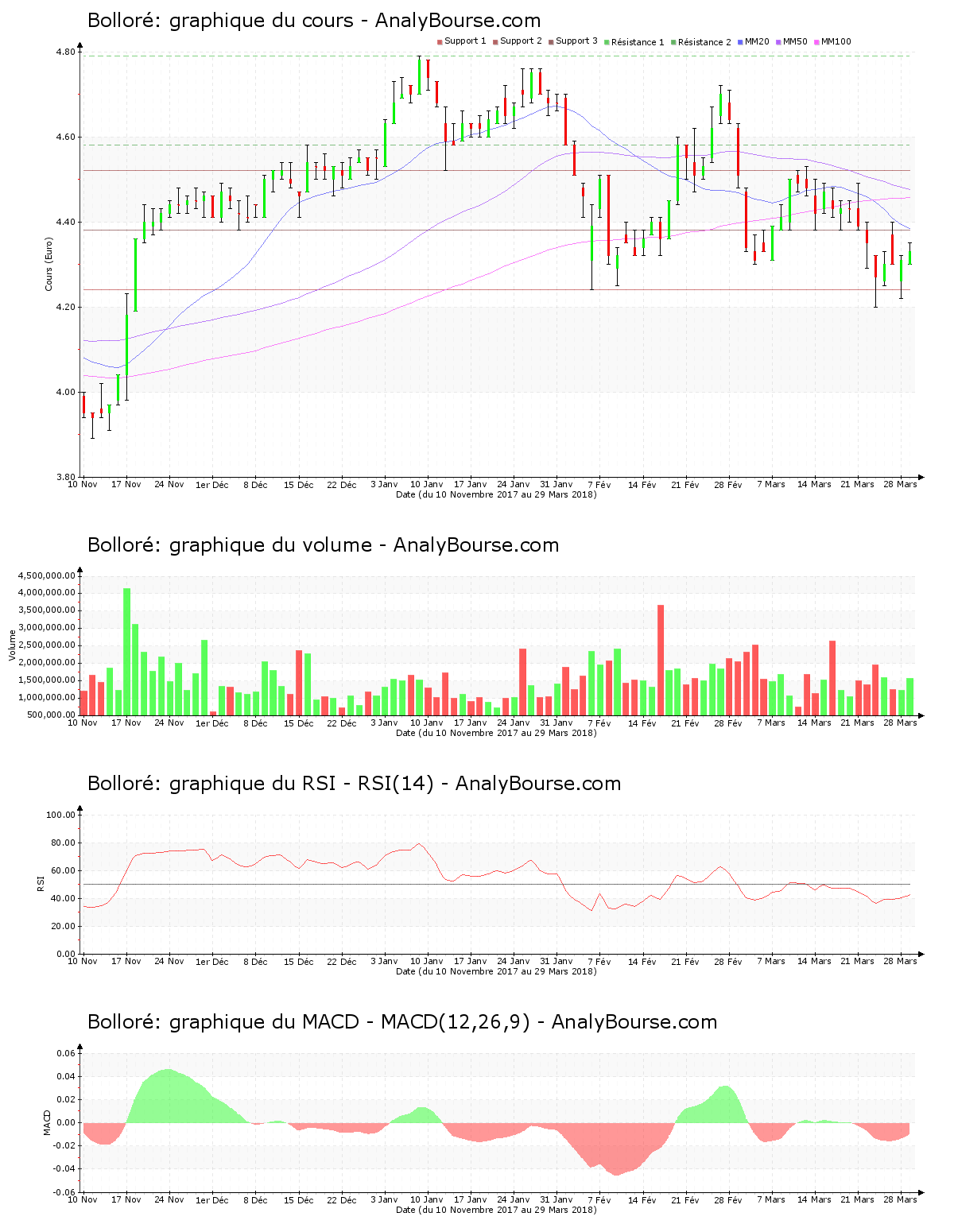 Concernant les indicateurs, voici désormais 32 jours de cotations que la moyenne mobile sur 20 jours de la valeur Bolloré se situe en deçà de sa moyenne mobile sur 50 jours. Pour sa part, le RSI est ces cinq dernières séances plutôt stable. Il se situe par conséquent encore au niveau de vente. Pour terminer, l’indicateur MACD est relativement stable cette semaine. C’est donc toujours une tendance du cours assez stable que ce dernier représente à moyen terme.