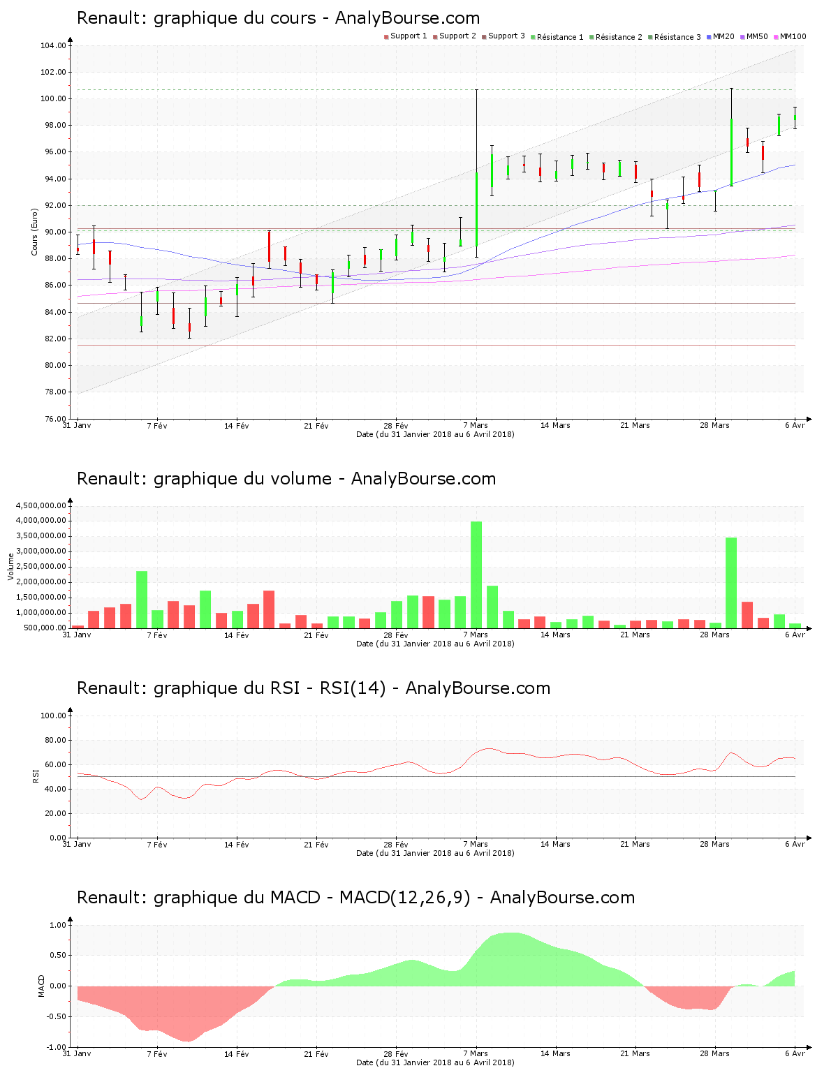 |Avec un comportement haussier de 6.06%, l’action Renault bondit ces dernières séances. Elle se revend maintenant à 98.750 €. Avec un cours baissier de 0.98%, Renault était relativement stable la semaine dernière. Le mouvement haussier reprend ainsi ces derniers jours. On remarque des échanges assez fébriles ces cinq derniers jours de cotations sur le cours, avec un taux de 7.84% espaçant le maximum du minimum de Renault. Le développement du titre l’amène à présent près de la résistance des 100.700 €. L’action se positionne dans la limite inférieure du canal dans lequel cette dernière se développe depuis plusieurs semaines.