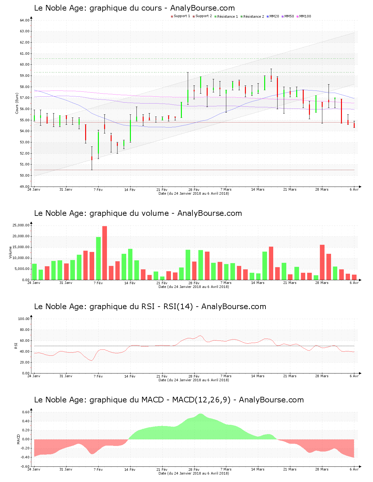 On constate que l’indicateur RSI est relativement stable ces derniers jours. Il se localise ainsi encore dans le niveau de vente. La moyenne mobile sur 50 jours de l’action Le Noble Age se place maintenant en deçà de sa moyenne mobile sur 100 jours depuis 56 jours de cotations. Pour finir, on repère que ces derniers jours le MACD est en vigoureuse régression. C’est désormais une évolution du titre en vigoureuse régression qu’il suggère à moyen-court terme.