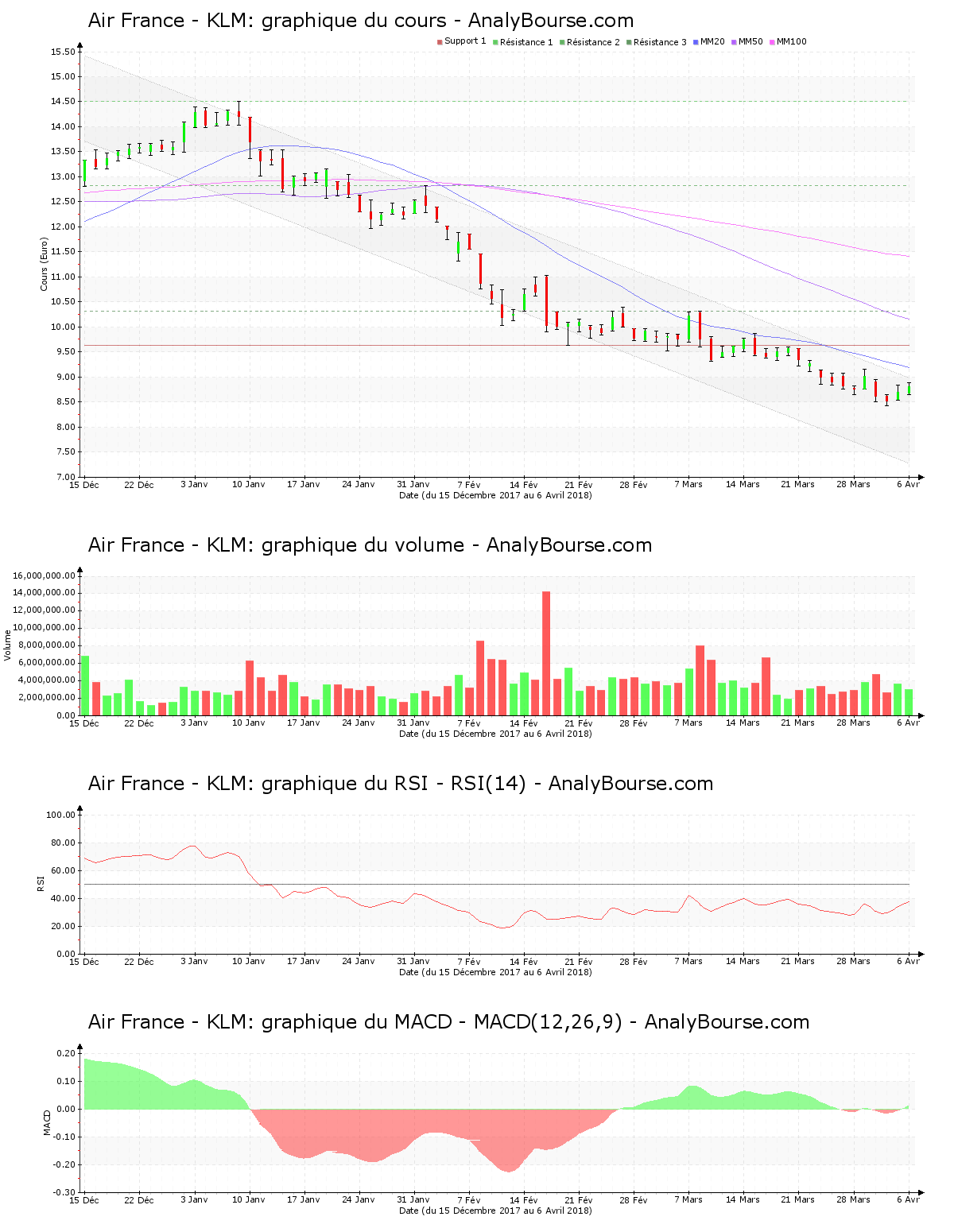 Du côté des indicateurs, l’indicateur RSI est relativement stable cette semaine. Ce dernier se trouve ainsi toujours au niveau de vente. Le MACD est ces derniers jours en croissance. C’est dorénavant une trajectoire du titre stable qu’il représente à moyen terme. Vendredi dernier, l’indicateur MACD a basculé en secteur positif, ce qui pourrait caractériser un enclenchement de tendance croissante sur une longue période pour Air France – KLM. Pour finir, la valeur Air France – KLM a une moyenne mobile sur vingt jours positionnée en deçà de sa moyenne mobile sur cinquante jours, qui est quant à elle positionnée en deçà de sa moyenne mobile sur cent jours. Sur une longue période, le parcours de l’action est par conséquent en décroissance. Depuis finalement 43 jours, la moyenne mobile sur vingt jours de l’action Air France – KLM se situe en deçà de sa moyenne mobile sur cinquante jours.
