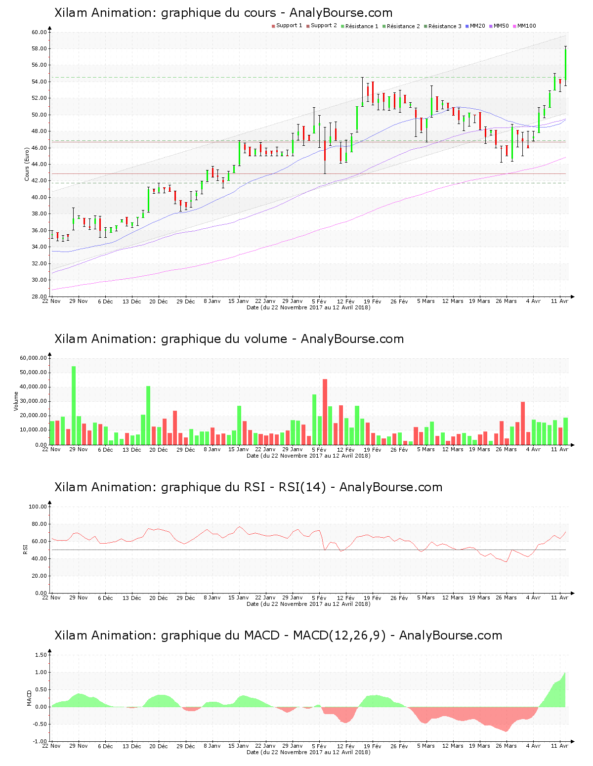 Avec un volume à la clôture de sensiblement 19000 actions échangées, l’intention d’achat sur Xilam Animation ce jeudi 12 avril est extrêmement importante, animée par un cours croissant de 7.62%. L’action atteint dorénavant la cotation de 57.900 €. L’intention d’achat sur Xilam Animation hier était au contraire faible, imprégnée par un mouvement baissier de 1.47%. L’orientation se retourne ainsi de manière sensible ce jeudi 12 avril. Remarquons, avec un pourcentage de 8.97% qui distance ce jeudi les extremums, une volatilité manifeste sur la valeur. Le cours a franchi la résistance des 54.500 € ce jeudi 12 avril.