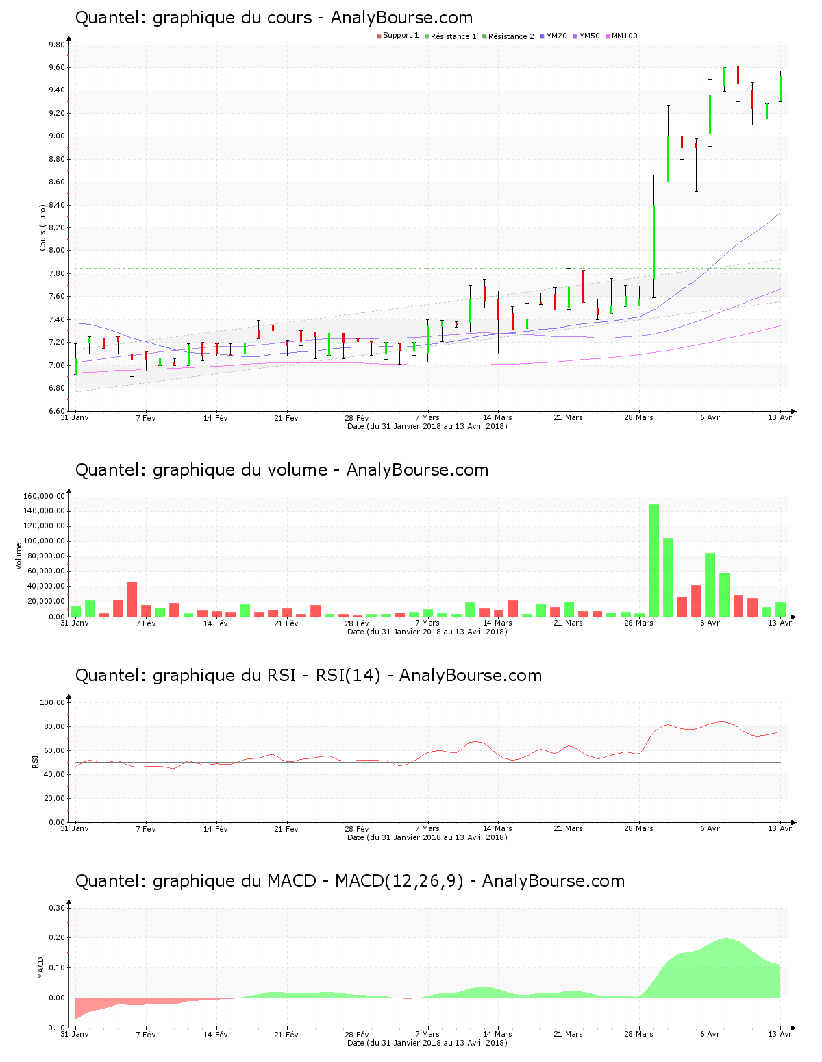 Du côté des indicateurs, on constate que cette semaine l’indicateur RSI est plutôt stable. C’est ainsi encore dans le niveau de surachat que ce dernier se trouve. On repère que ces dernières séances le MACD est en grande diminution. Ce dernier dévoile néanmoins toujours une évolution du cours en importante progression sur le moyen-court terme. Pour finir, la moyenne mobile sur 20 jours de la valeur Quantel est située au-dessus de sa moyenne mobile sur 50 jours, qui est pour sa part située au-delà de sa moyenne mobile sur 100 jours. Sur une longue période, l’action traduit ainsi un cours haussier. Ceci fait à présent 67 séances de cotations que la moyenne mobile sur 50 jours de la valeur Quantel se positionne au-delà de sa moyenne mobile sur 100 jours.