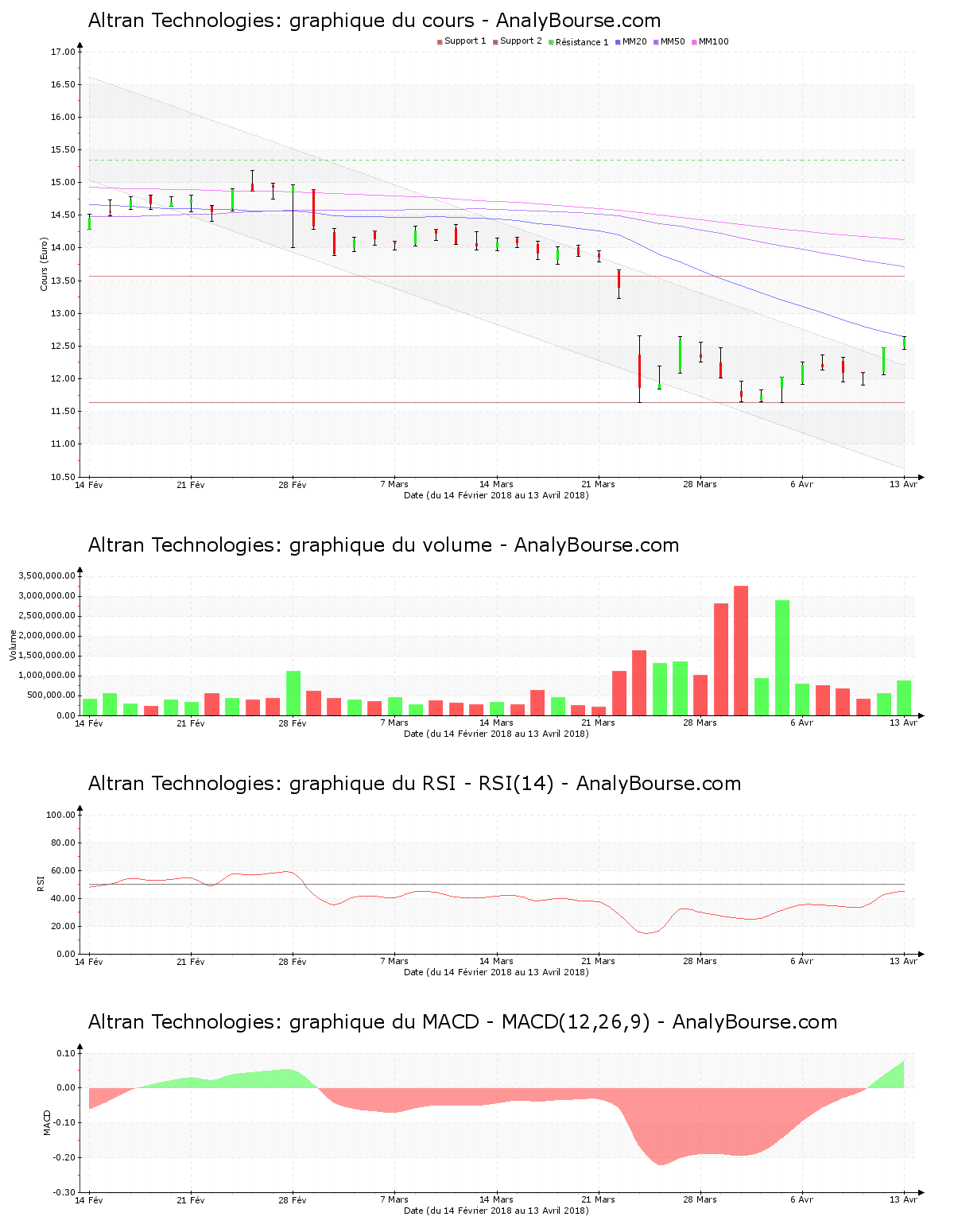 Côté indicateurs, on repère que le RSI est relativement stable ces cinq derniers jours de cotations. Ce dernier se situe par conséquent encore dans le niveau neutre. De son côté, pour l’indicateur MACD, on repère que ce dernier est en substantielle croissance ces derniers jours. C’est maintenant une tendance du titre en conséquente progression qu’il caractérise sur le moyen-court terme. Le MACD est passé du côté positif jeudi dernier, ce qui peut révèler une amorce de tendance en augmentation à longue échéance pour Altran Technologies. La moyenne mobile sur vingt jours de la valeur Altran Technologies se positionne en deçà de la moyenne mobile sur cinquante jours, qui se positionne quant à elle en deçà de la moyenne mobile sur cent jours. A longue échéance, l’action dévoile ainsi un cours en régression. Depuis finalement 31 jours, la moyenne mobile sur vingt jours de la valeur Altran Technologies se trouve en deçà de sa moyenne mobile sur cinquante jours.