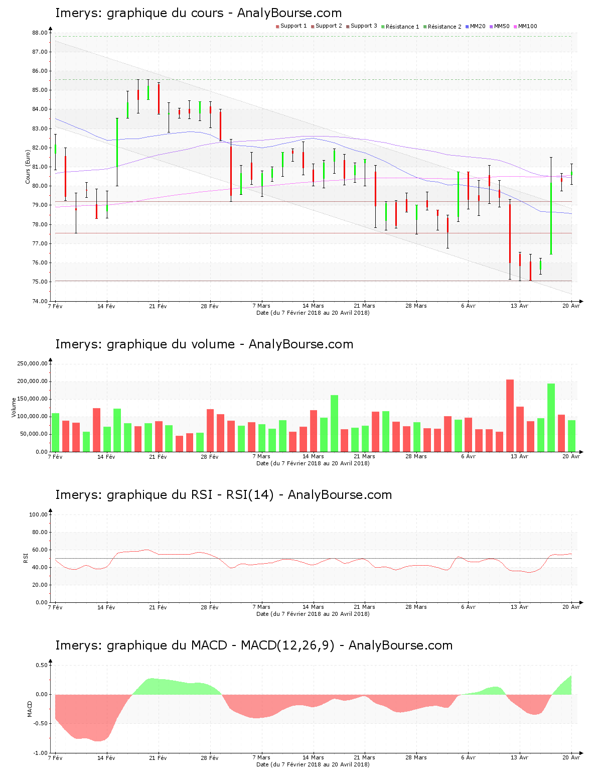 |Imerys est ces dernières séances très désiré, avec un comportement en grande augmentation de 6.47%. La valeur se revend à présent à 80.750 €. Imerys était à l’opposé la semaine dernière attaqué, avec un parcours en vigoureuse diminution de 4.36%. La valeur Imerys bondit donc avec force ces dernières séances. Imerys montre une relative agitation ces derniers jours, le cours naviguant dans des limites de 8.54%. La valeur se situe largement au-dessus de son canal. Elle ne s’enclave de fait plus dans le canal dans lequel elle cheminait depuis un certain temps.