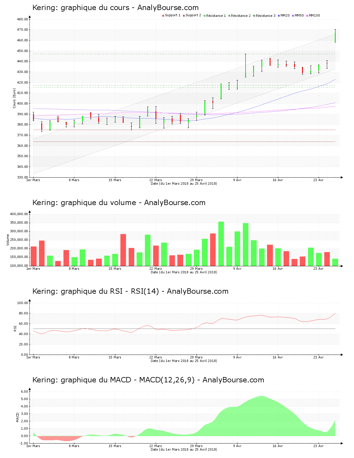 Le mouvement haussier de la valeur Kering persiste à présent depuis 4 séances. Le cours de Kering supporte par conséquent depuis vendredi dernier une vigoureuse pression acheteuse, représentée par un cours croissant de 8.93%. La valeur Kering supporte ce jour une ferme pression acheteuse, imprégnée par un mouvement haussier de 6.64%, dans un volume d’à peu près 143000 actions échangées à 09:41. L’action s’envole dorénavant de 29.100 €, partant de 438.200 € pour parvenir à 467.300 €. Avec un parcours assez stable de 0.44%, Kering était hier relativement peu entouré. Le mouvement haussier reprend par conséquent ce mercredi. Kering initiant la séance de cotations à 458.000 €, on constate aussi sur le cours l’existence d’un gap haussier de 4.52% à l’ouverture de la cotation. Le titre a franchi la résistance des 447.000 € ce jour. La valeur est sortie ce jour par la limite supérieure du canal à l’intérieur duquel elle se déployait ces dernières semaines. Finalement, cette dernière oscille au-delà de son canal. Depuis le mardi 13 mars 2018, date de son entrée dans le canal, l’action a récolté 22.17%.