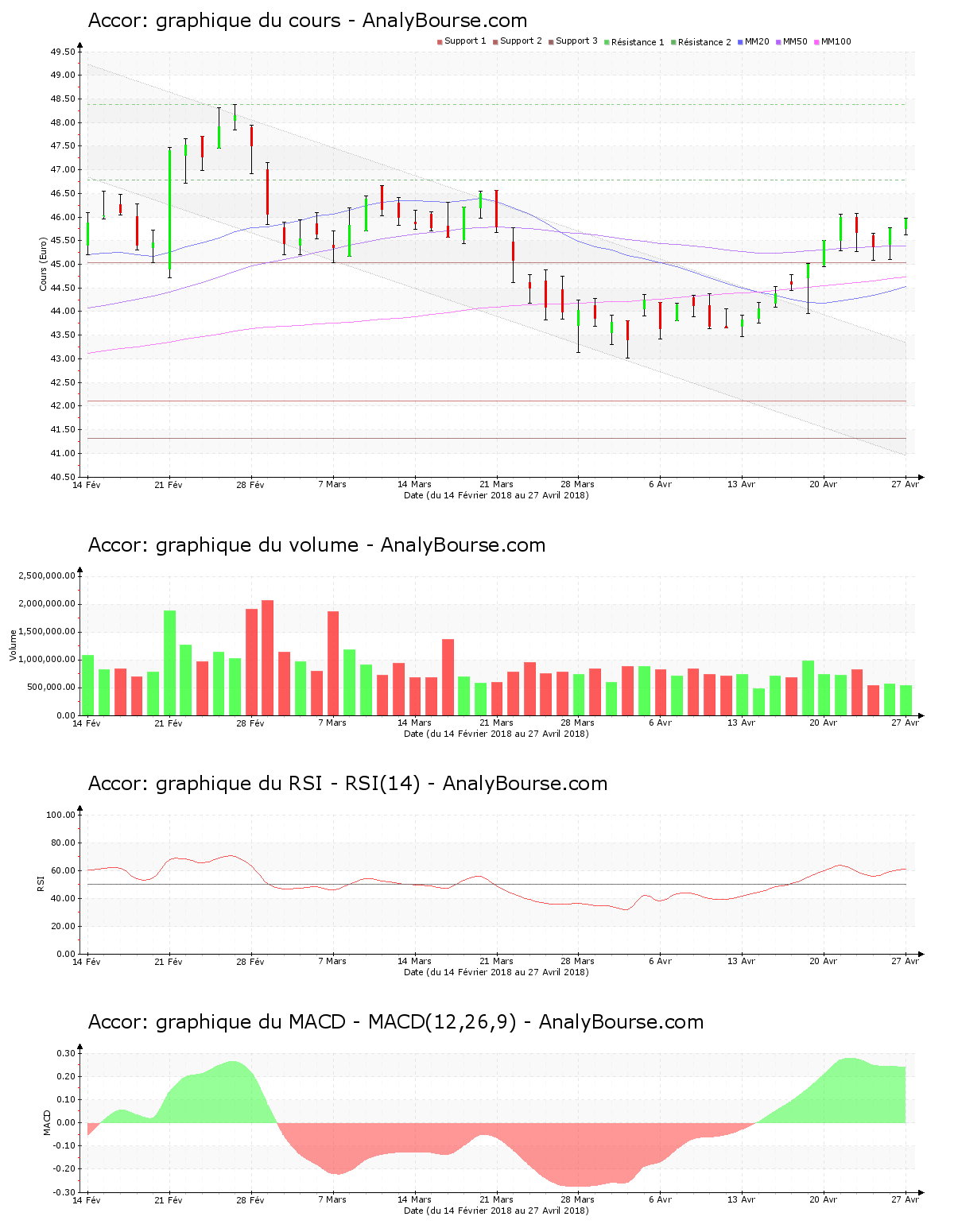 |Avec un mouvement haussier de 0.99%, l’action Accor est plutôt stable ces cinq dernières séances de cotations. Elle atteint en effet juste 45.960 €. Accor s’appréciait au contraire la semaine dernière, avec un cours croissant de 3.83%. Le titre se développe à présent près de la résistance des 46.790 €. L’action est sortie par la limite supérieure du canal dans lequel cette dernière variait depuis quelques temps. Désormais, cette dernière navigue sérieusement au-dessus de son canal.