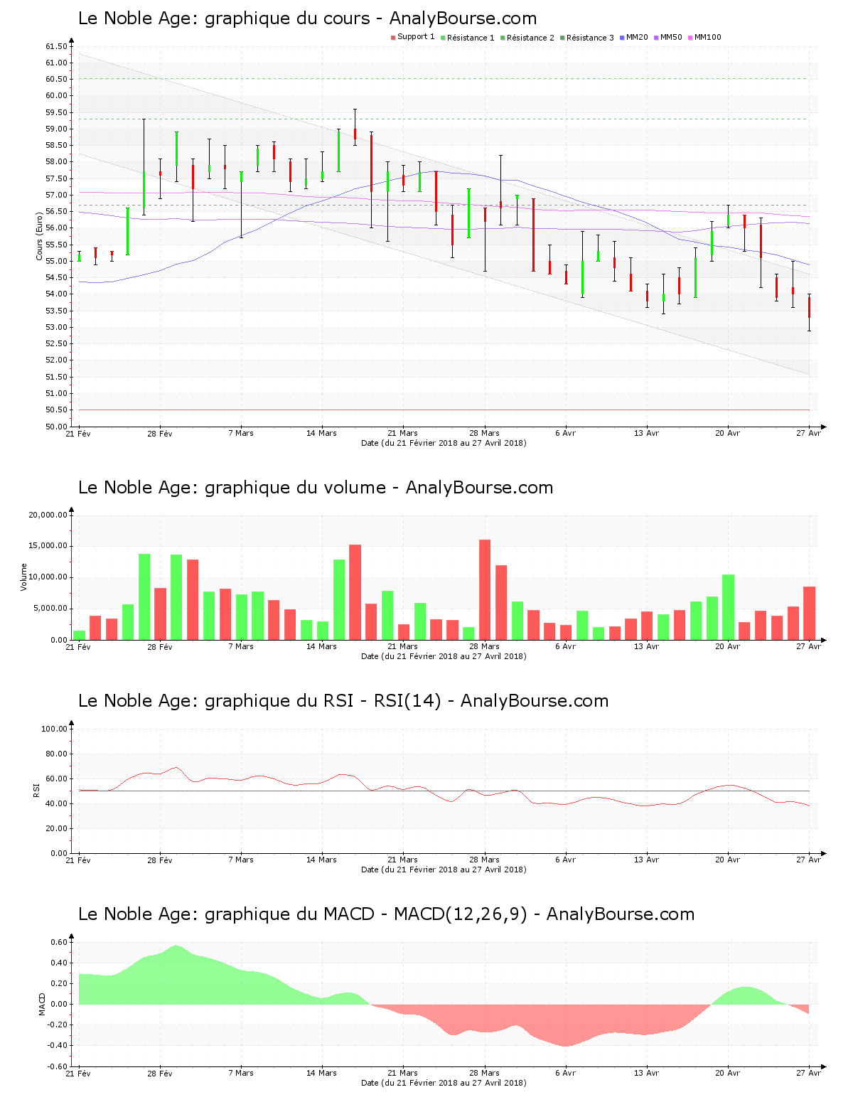 On constate que ces derniers jours le RSI est en diminution. Il se place désormais dans le niveau de vente. De son côté, l’indicateur MACD est en importante décroissance ces cinq dernières séances de cotations. Il montre désormais une évolution du titre en substantielle diminution sur le moyen-court terme. Le MACD a basculé en territoire négatif jeudi dernier, ce qui pourrait montrer un début d’une évolution en décroissance sur le long terme pour Le Noble Age. Pour finir, la moyenne mobile sur vingt jours de la valeur Le Noble Age est placée en deçà de sa moyenne mobile sur cinquante jours, qui est elle-même placée en-dessous de sa moyenne mobile sur cent jours. Sur la durée, la valeur exprime donc un comportement décroissant. Voilà dorénavant 71 jours que la moyenne mobile sur cinquante jours de la valeur Le Noble Age se place en deçà de sa moyenne mobile sur cent jours.