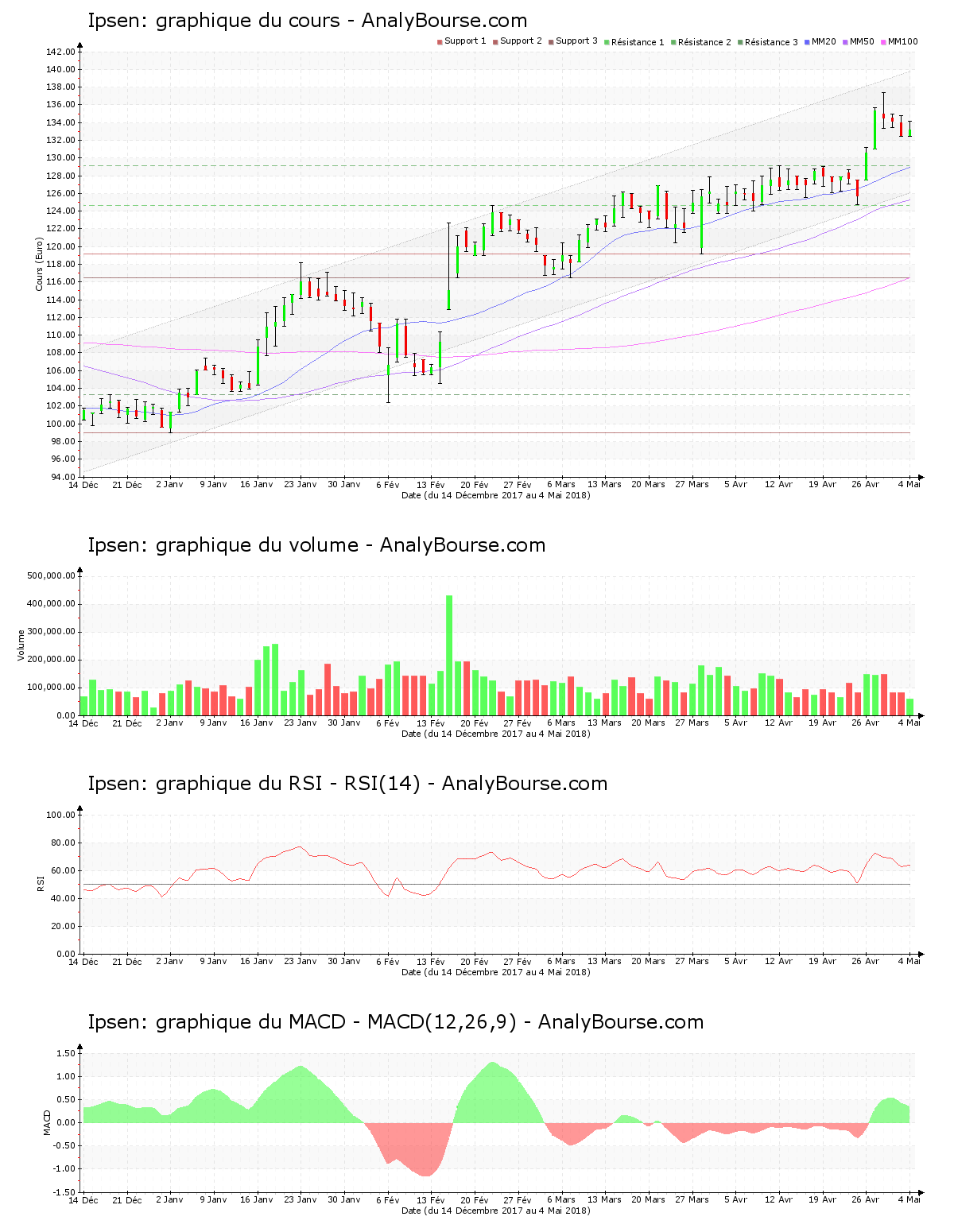 En ce qui concerne les indicateurs, concernant l’indicateur MACD, on note que ce dernier est en forte hausse ces dernières séances. Il esquisse à présent une évolution du cours en substantielle croissance sur le moyen terme. L’indicateur MACD est passé en territoire positif le vendredi 27 avril 2018, ceci peut suggérer un début de tendance croissante à long terme pour Ipsen. On repère que l’indicateur RSI est relativement stable ces dernières séances. Ce dernier se localise par conséquent encore au niveau d’achat. Pour finir, la moyenne mobile sur vingt jours de l’action Ipsen se place au-delà de la moyenne mobile sur cinquante jours, qui se situe quant à elle au-dessus de la moyenne mobile sur cent jours. Le parcours de l’action est donc en augmentation sur la durée. La moyenne mobile sur vingt jours de l’action Ipsen se trouve maintenant au-delà de sa moyenne mobile sur cinquante jours depuis 79 séances de cotations.