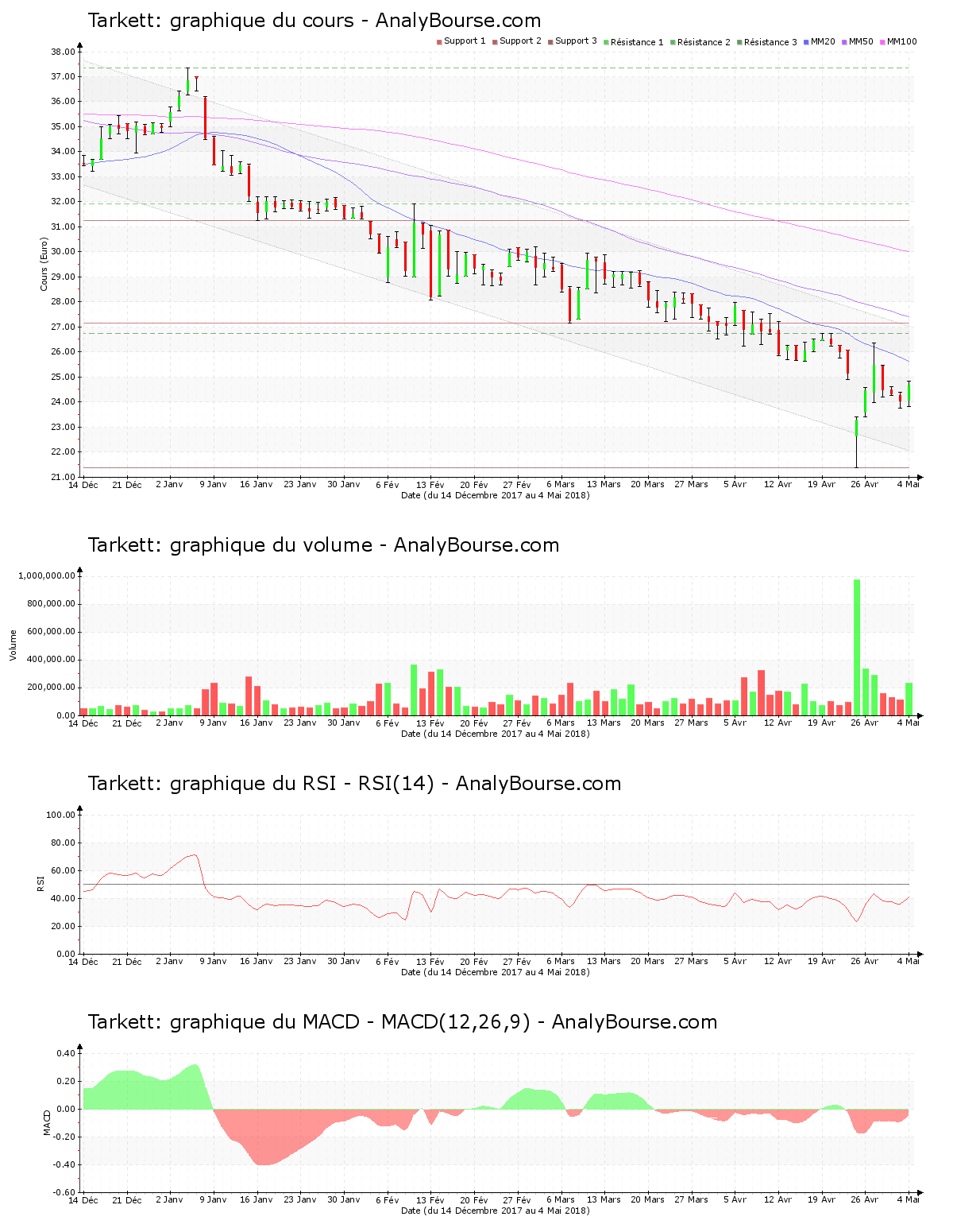 Ces informations constituent une analyse technique de la valeur Tarkett au dimanche 6 mai 2018. Cette analyse peut être invalidée par des éléments plus récents, et ne constitue en aucune manière une incitation d’achat ou de vente sur les marchés financiers. Le lecteur reste libre et responsable de l’interprétation et de l’usage faits de ces informations.