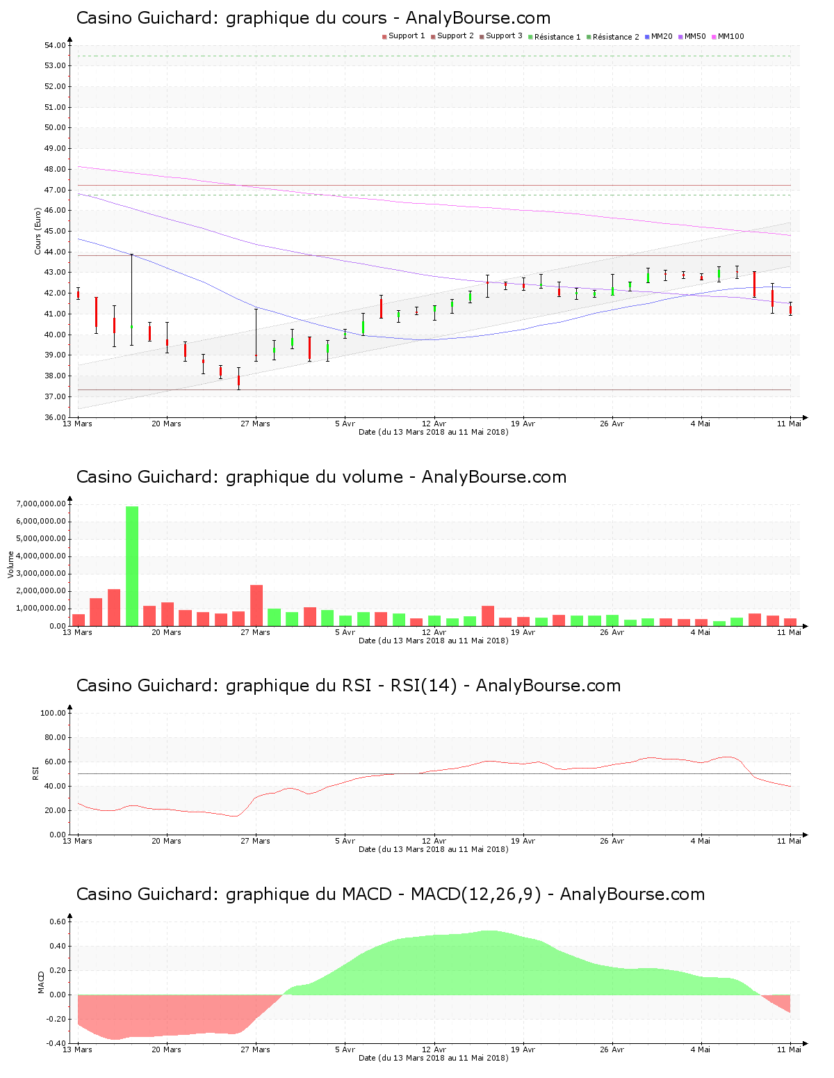En ce qui concerne les indicateurs, on constate que ces cinq dernières séances l’indicateur MACD est en importante baisse. Ce dernier révèle à présent une tendance du cours en importante baisse sur le moyen terme. Le MACD a basculé en terrain négatif jeudi dernier, ce qui pourrait indiquer un début d’une orientation décroissante sur une longue période pour Casino Guichard. Pour sa part, pour le RSI, on note qu’il est en diminution ces cinq dernières séances de cotations. C’est désormais au niveau de vente qu’il se situe. Depuis à présent 61 jours de cotations, la moyenne mobile sur cinquante jours de l’action Casino Guichard se localise en deçà de sa moyenne mobile sur cent jours.
