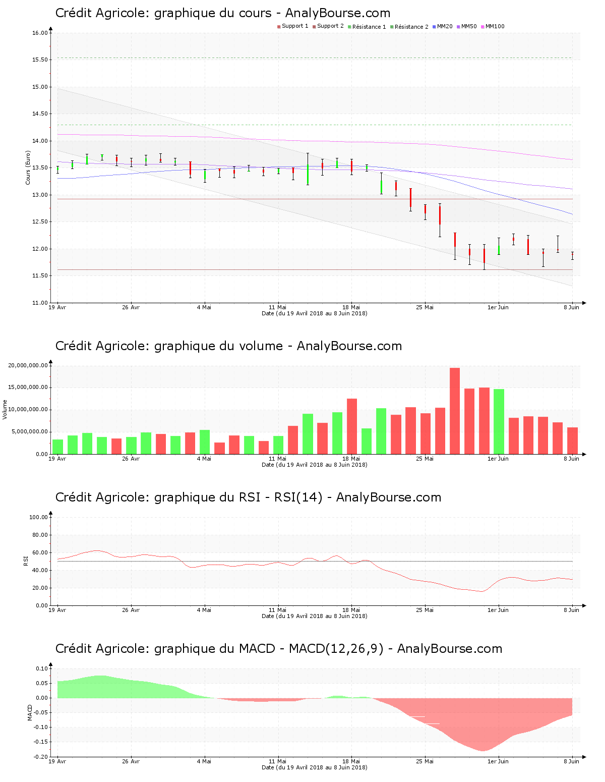 Ces informations constituent une analyse technique de la valeur Crédit Agricole au samedi 9 juin 2018. Cette analyse peut être invalidée par des éléments plus récents, et ne constitue en aucune manière une incitation d’achat ou de vente sur les marchés financiers. Le lecteur reste libre et responsable de l’interprétation et de l’usage faits de ces informations.