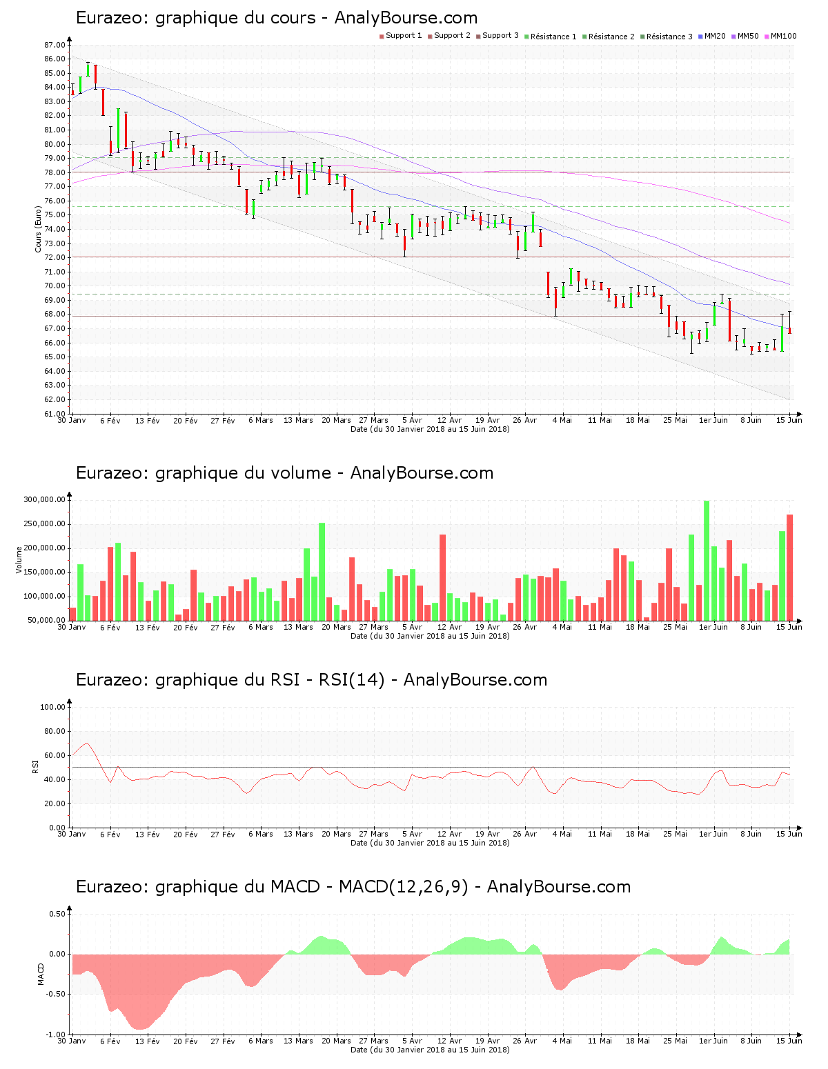 Ces informations constituent une analyse technique de l’action Eurazeo au dimanche 17 juin 2018. Cette analyse peut être invalidée par des éléments plus récents, et ne constitue en aucune manière une incitation d’achat ou de vente sur les marchés financiers. Le lecteur reste libre et responsable de l’interprétation et de l’usage faits de ces informations.