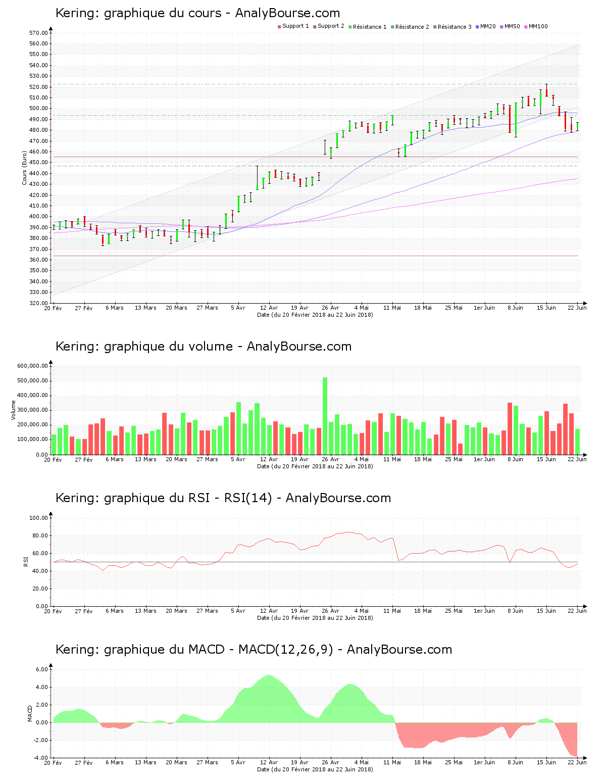 Ces informations constituent une analyse technique de l’action Kering au samedi 23 juin 2018. Cette analyse peut être invalidée par des éléments plus récents, et ne constitue en aucune manière une incitation d’achat ou de vente sur les marchés financiers. Le lecteur reste libre et responsable de l’interprétation et de l’usage faits de ces informations.