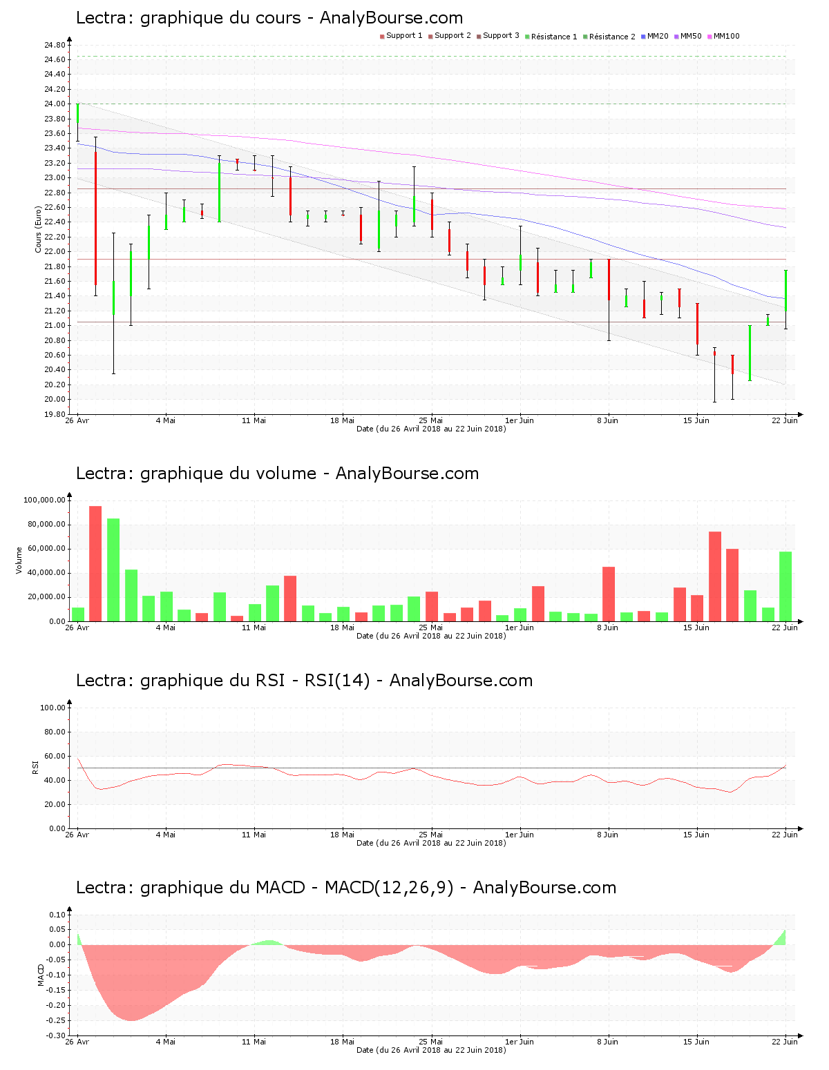 Pour les indicateurs, l’action Lectra a une moyenne mobile sur vingt jours positionnée en deçà de sa moyenne mobile sur cinquante jours, qui est quant à elle positionnée en-dessous de sa moyenne mobile sur cent jours. L’action enregistre par conséquent un développement décroissant sur le long terme. De son côté, l’indicateur MACD est cette semaine en conséquente hausse. C’est désormais une trajectoire du titre en augmentation que ce dernier révèle sur le moyen terme. Hier, le MACD a basculé en territoire positif, ce qui peut ébaucher un enclenchement d’une évolution haussière sur une longue période pour Lectra. On remarque que ces dernières séances l’indicateur RSI est en progression. C’est finalement au niveau neutre qu’il se place.