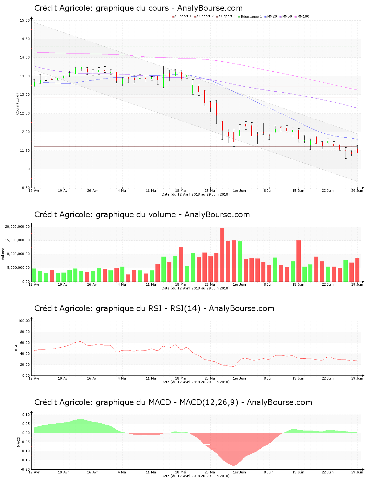 Côté indicateurs, le RSI est plutôt stable ces derniers jours. C’est par conséquent toujours au niveau de vente que ce dernier se localise. De son côté, on repère que cette semaine l’indicateur MACD est assez stable. C’est ainsi encore une trajectoire du cours assez stable qu’il montre à court-moyen terme. Enfin, la moyenne mobile sur 20 jours de la valeur Crédit Agricole est localisée en deçà de sa moyenne mobile sur 50 jours, qui est pour sa part située en-dessous de sa moyenne mobile sur 100 jours. Sur le long terme, la valeur traduit par conséquent un cours baissier. La moyenne mobile sur 50 jours de la valeur Crédit Agricole se positionne dorénavant en deçà de sa moyenne mobile sur 100 jours depuis 69 jours de cotations.