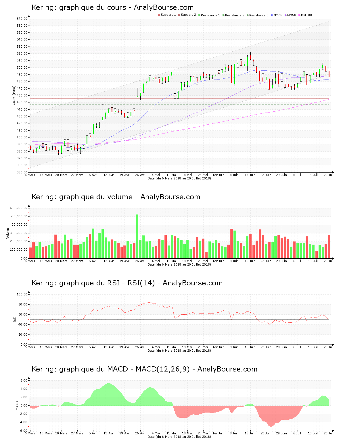 Côté indicateurs, concernant l’indicateur MACD, on repère qu’il est en substantielle hausse ces cinq derniers jours de cotations. C’est finalement une trajectoire du titre en vigoureuse hausse que ce dernier signale sur le moyen-court terme. De son côté, depuis dorénavant 66 jours, la moyenne mobile sur cinquante jours de l’action Kering se place au-dessus de sa moyenne mobile sur cent jours. Enfin, pour le RSI, on note que ce dernier est en baisse cette semaine. Ce dernier se positionne dorénavant dans le niveau neutre.