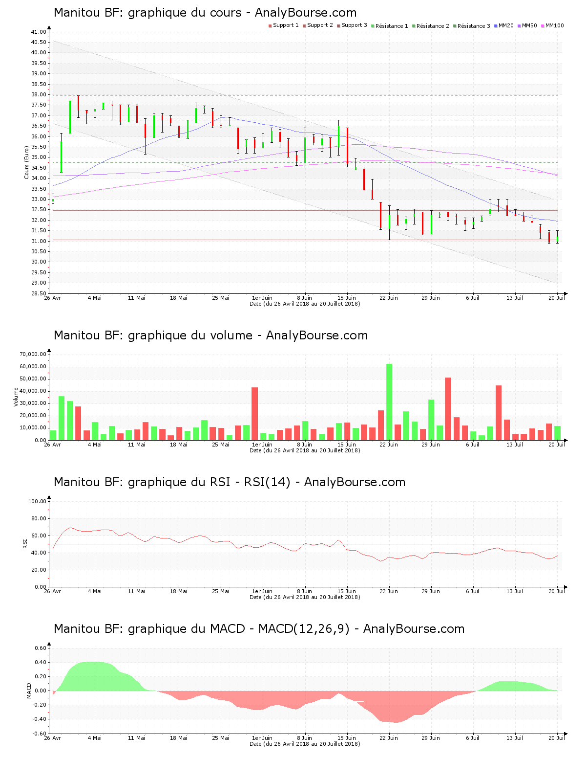 Pour les indicateurs, pour l’indicateur MACD, on note qu’il est en solide régression cette semaine. Il signale finalement une trajectoire du cours relativement stable sur le moyen terme. Pour sa part, l’indicateur RSI est stable ces cinq dernières séances de cotations. Ce dernier se localise donc encore dans le niveau de vente. Enfin, la moyenne mobile sur 50 jours de l’action Manitou BF se positionne en deçà de sa moyenne mobile sur 100 jours depuis mercredi dernier. La moyenne mobile sur 20 jours de la valeur Manitou BF se localise en deçà de la moyenne mobile sur 50 jours, et la moyenne mobile sur 50 jours se situe pour sa part en deçà de la moyenne mobile sur 100 jours. Le parcours de la valeur est par conséquent en décroissance à long terme.