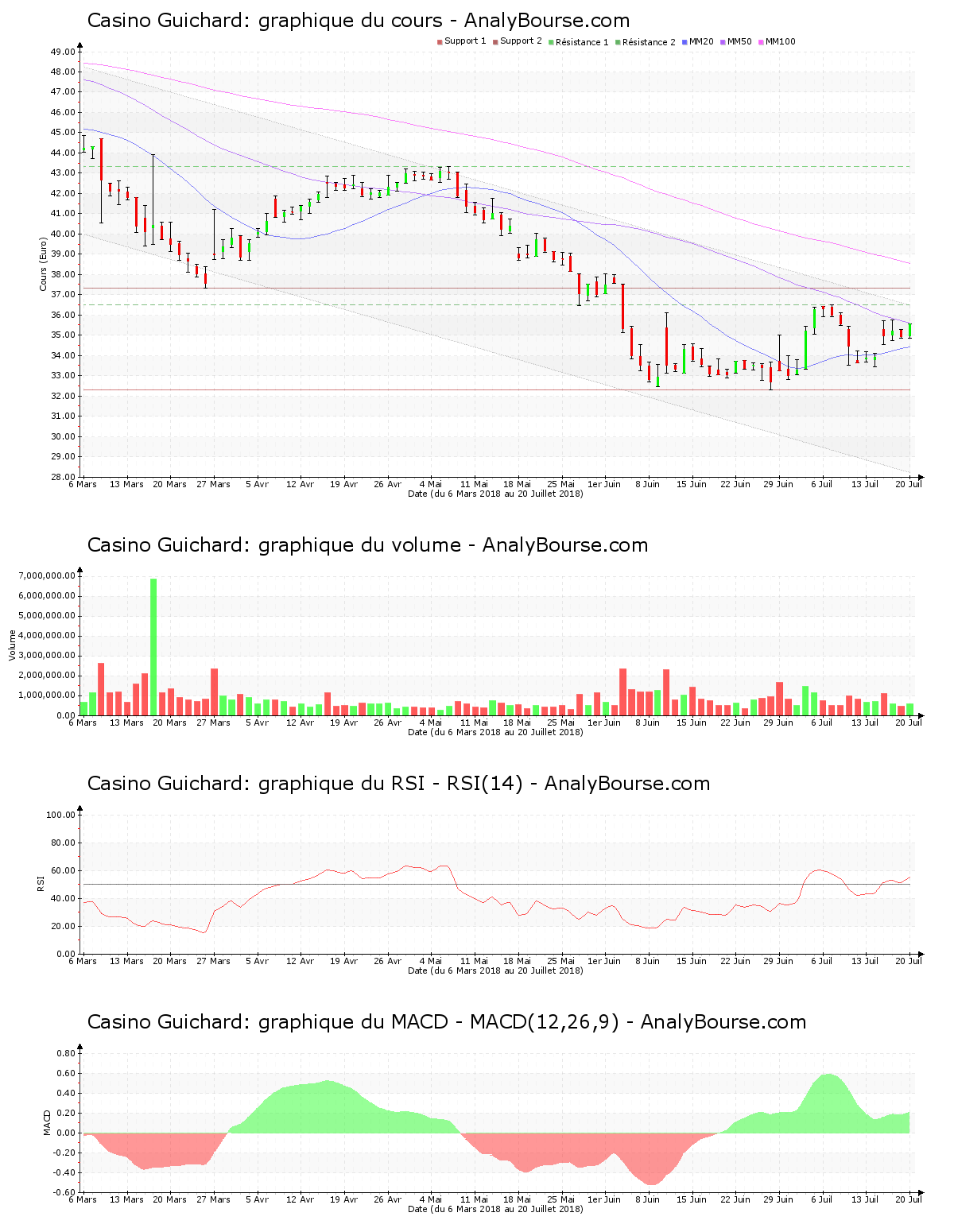 Du côté des indicateurs, on observe que ces cinq dernières séances de cotations l’indicateur MACD est en croissance. C’est finalement une trajectoire du cours en grande augmentation qu’il esquisse sur le moyen-court terme. Ensuite, on remarque que ces cinq derniers jours de cotations l’indicateur RSI est en hausse. Ce dernier se localise finalement dans le niveau d’achat. Pour terminer, la moyenne mobile sur vingt jours de l’action Casino Guichard se trouve en deçà de la moyenne mobile sur cinquante jours, qui se positionne quant à elle en deçà de la moyenne mobile sur cent jours. Sur le long terme, l’action présente donc un cours en régression. La moyenne mobile sur vingt jours de l’action Casino Guichard se localise finalement en deçà de sa moyenne mobile sur cinquante jours depuis 39 jours de cotations.