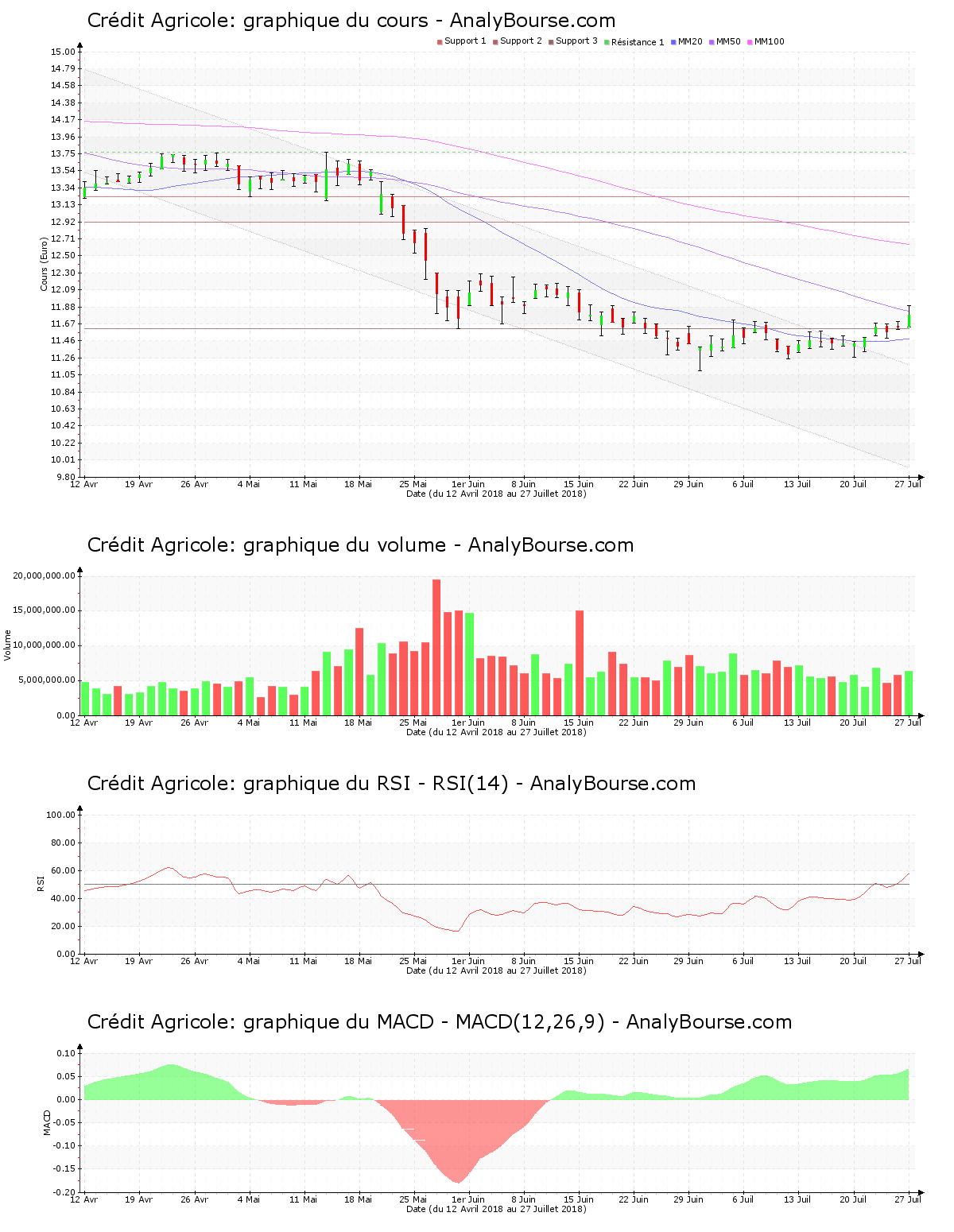 On remarque que cette semaine l’indicateur RSI est en progression. C’est dorénavant au niveau d’achat que ce dernier se localise. De son côté, la valeur Crédit Agricole possède une moyenne mobile sur 20 jours positionnée en-dessous de sa moyenne mobile sur 50 jours, qui est elle-même localisée en deçà de sa moyenne mobile sur 100 jours. Sur la durée, l’action traduit donc un cours baissier. La moyenne mobile sur 20 jours de l’action Crédit Agricole se situe à présent en deçà de sa moyenne mobile sur 50 jours depuis 46 séances. Enfin, on constate que ces cinq dernières séances l’indicateur MACD est en croissance. Ce dernier révèle maintenant une trajectoire du cours en forte hausse sur le moyen terme.