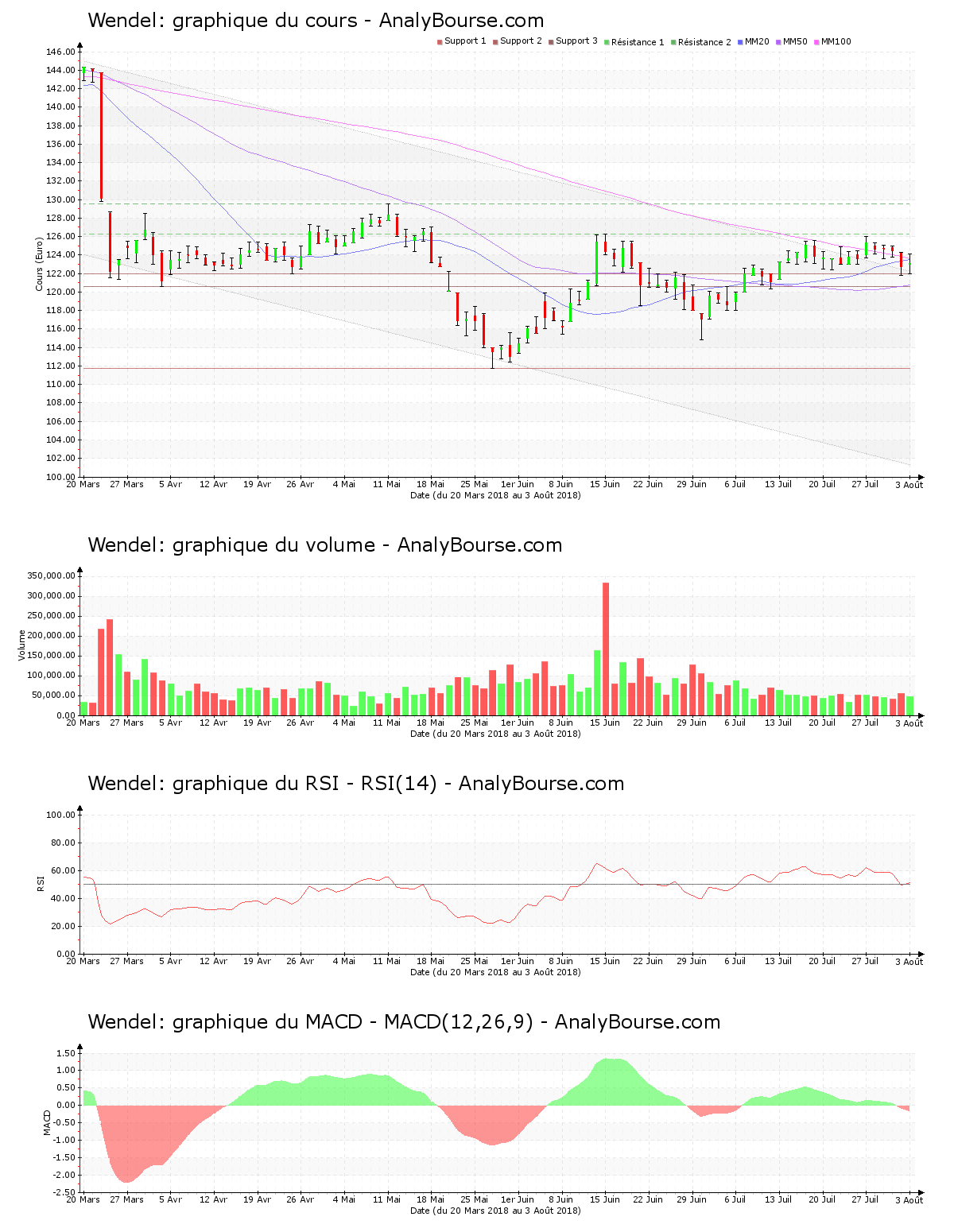 On remarque que le RSI est en diminution cette semaine. Ce dernier se trouve dorénavant dans le niveau neutre. Pour sa part, voilà finalement 92 jours de cotations que la moyenne mobile sur 50 jours de la valeur Wendel se localise en deçà de sa moyenne mobile sur 100 jours. Pour terminer, on observe que l’indicateur MACD est en solide régression ces dernières séances. C’est dorénavant une évolution du titre en forte baisse qu’il dessine sur le moyen-court terme. L’indicateur MACD est passé en territoire négatif jeudi dernier, ceci peut indiquer un enclenchement de tendance en décroissance à long terme pour Wendel.