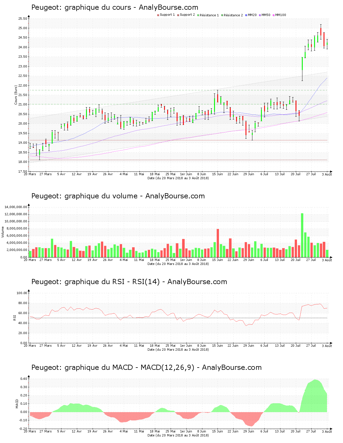 Ces informations constituent une analyse technique de la valeur Peugeot au dimanche 5 août 2018. Cette analyse peut être invalidée par des éléments plus récents, et ne constitue en aucune manière une incitation d’achat ou de vente sur les marchés financiers. Le lecteur reste libre et responsable de l’interprétation et de l’usage faits de ces informations.