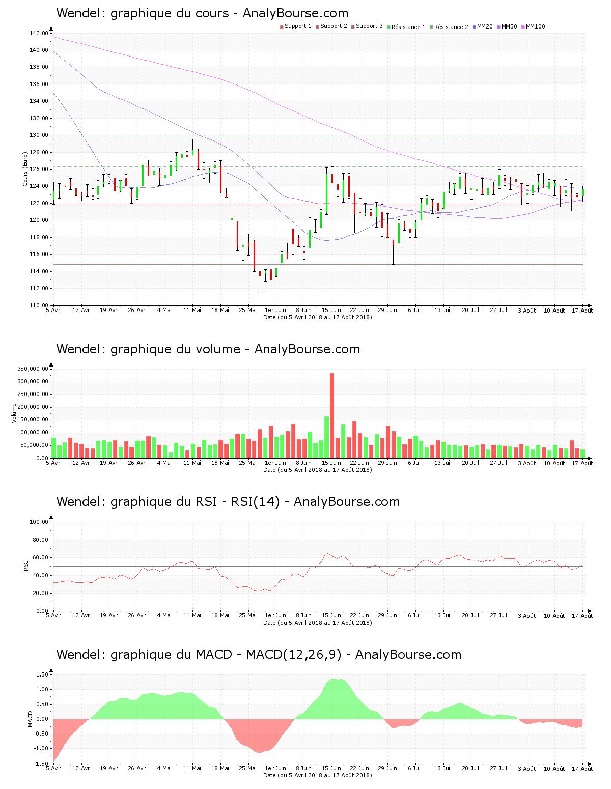 Ces informations constituent une analyse technique de la valeur Wendel au dimanche 19 août 2018. Cette analyse peut être invalidée par des éléments plus récents, et ne constitue en aucune manière une incitation d’achat ou de vente sur les marchés financiers. Le lecteur reste libre et responsable de l’interprétation et de l’usage faits de ces informations.