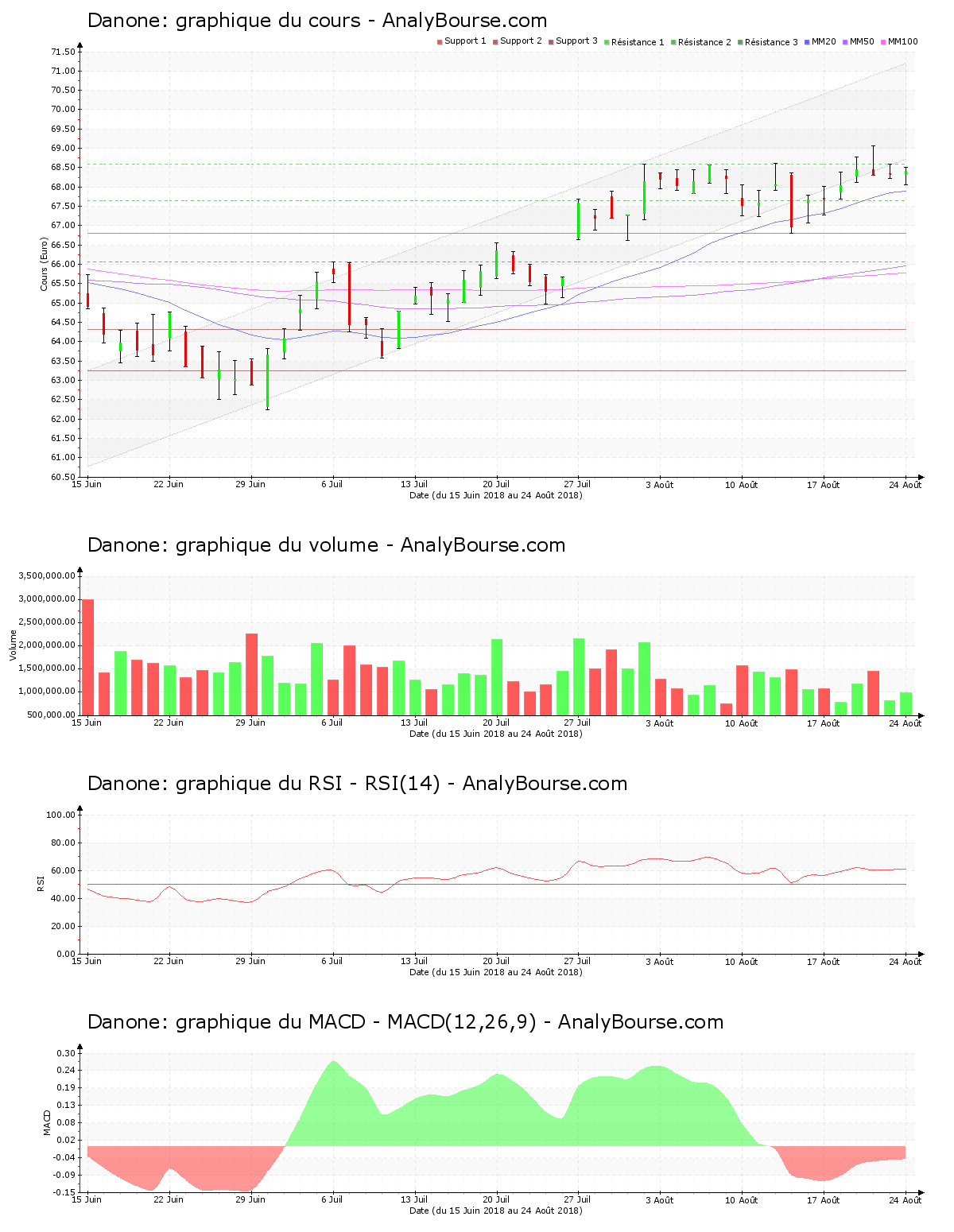 La moyenne mobile sur vingt jours de l’action Danone est située au-delà de sa moyenne mobile sur cinquante jours, qui est quant à elle localisée au-delà de sa moyenne mobile sur cent jours. La valeur affiche par conséquent un mouvement haussier sur une longue période. Pour sa part, on remarque que l’indicateur MACD est en forte croissance cette semaine. Ce dernier signale cependant toujours une trajectoire du cours en diminution sur le moyen-court terme. Enfin, en ce qui concerne le RSI, on note que ce dernier est plutôt stable ces dernières séances. C’est donc encore au niveau d’achat qu’il se localise.