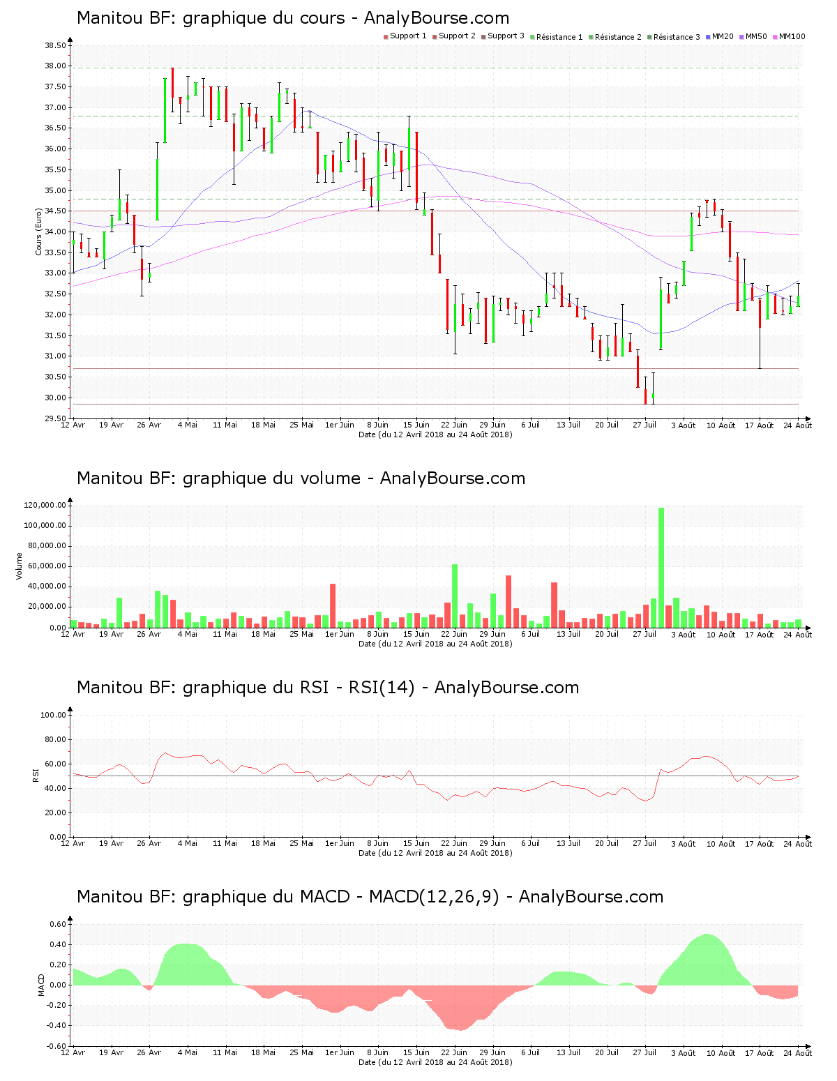 Ces informations constituent une analyse technique de l’action Manitou BF au samedi 25 août 2018. Cette analyse peut être invalidée par des éléments plus récents, et ne constitue en aucune manière une incitation d’achat ou de vente sur les marchés financiers. Le lecteur reste libre et responsable de l’interprétation et de l’usage faits de ces informations.