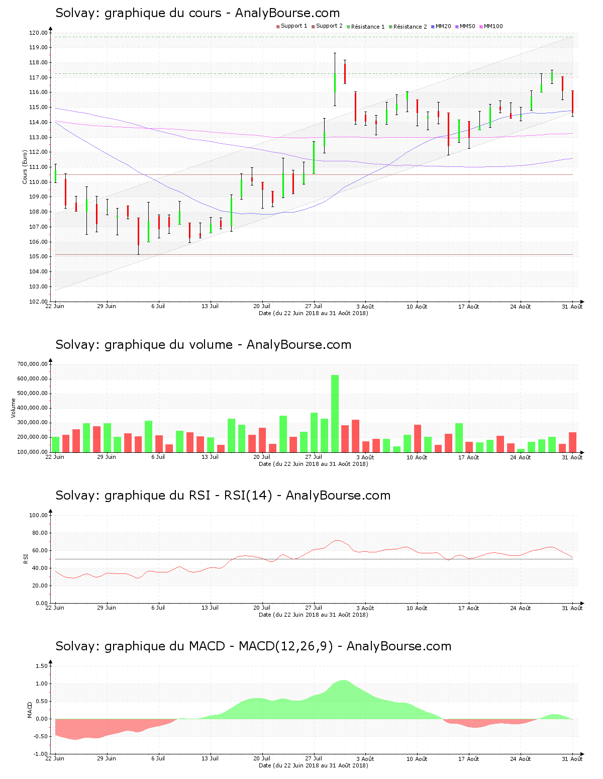 Avec un comportement plutôt stable de 0.17%, la valeur Solvay est ces cinq dernières séances de cotations relativement peu entourée. Passant de 114.450 € à 114.650 € cette semaine, elle s’apprécie faiblement en effet juste de 0.200 €. Avec un comportement haussier de 1.28%, Solvay augmentait au contraire la semaine dernière. Le comportement du titre le mène désormais proche de la résistance des 117.250 €. L’action se positionne en-dessous de son canal. Elle a en effet dépassé la limite inférieure du canal à l’intérieur duquel cette dernière évoluait ces dernières semaines.