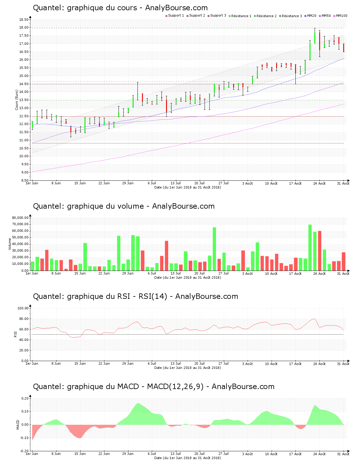 En ce qui concerne les indicateurs, on repère que ces cinq derniers jours le MACD est en solide régression. Ce dernier représente à présent une tendance du titre plutôt stable sur le court-moyen terme. Hier, l’indicateur MACD est passé en secteur négatif, ce qui peut esquisser un prémice d’une évolution en régression à long terme pour Quantel. Pour sa part, la moyenne mobile sur 20 jours de l’action Quantel est localisée au-delà de sa moyenne mobile sur 50 jours, qui est pour sa part placée au-delà de sa moyenne mobile sur 100 jours. La valeur traduit donc un cours haussier à longue échéance. Pour terminer, on relève que l’indicateur RSI est relativement stable ces cinq derniers jours. Il se localise ainsi encore au niveau d’achat.