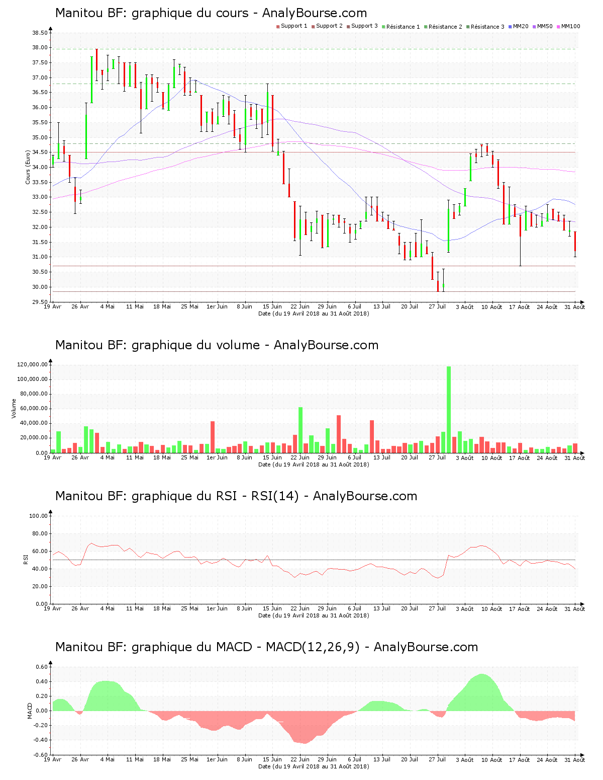 Ces informations constituent une analyse technique de l’action Manitou BF au samedi 1er septembre 2018. Cette analyse peut être invalidée par des éléments plus récents, et ne constitue en aucune manière une incitation d’achat ou de vente sur les marchés financiers. Le lecteur reste libre et responsable de l’interprétation et de l’usage faits de ces informations.