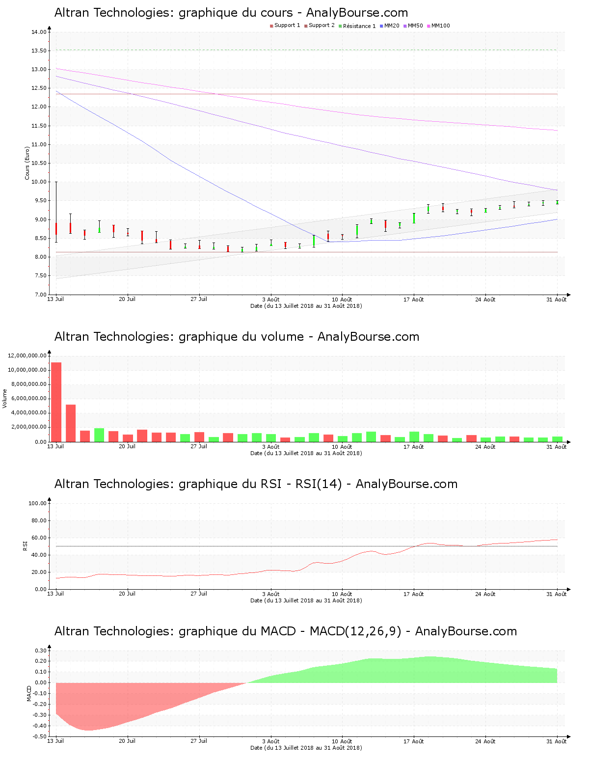Du côté des indicateurs, le MACD est en ferme décroissance ces cinq derniers jours. Il signale malgré tout encore une trajectoire du titre en solide augmentation sur le moyen-court terme. De son côté, la moyenne mobile sur 20 jours de la valeur Altran Technologies se place en deçà de la moyenne mobile sur 50 jours, et la moyenne mobile sur 50 jours se localise elle-même en deçà de la moyenne mobile sur 100 jours. Le comportement de l’action est donc en régression sur la durée. Voilà maintenant 43 jours de cotations que la moyenne mobile sur 20 jours de l’action Altran Technologies se positionne en deçà de sa moyenne mobile sur 50 jours. Enfin, le RSI est ces dernières séances relativement stable. Ce dernier se place ainsi encore au niveau d’achat.